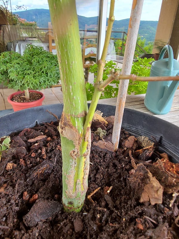 J’ai 2 érables greffés ainsi (venant d’Italie) sur des tiges épaisses de 3 ou 4 cm, de 80 cm de haut; je ne sais pas comment le greffon tient sur le porte greffe au départ ! Ensuite pas de problème, c’est un magnifique résultat.