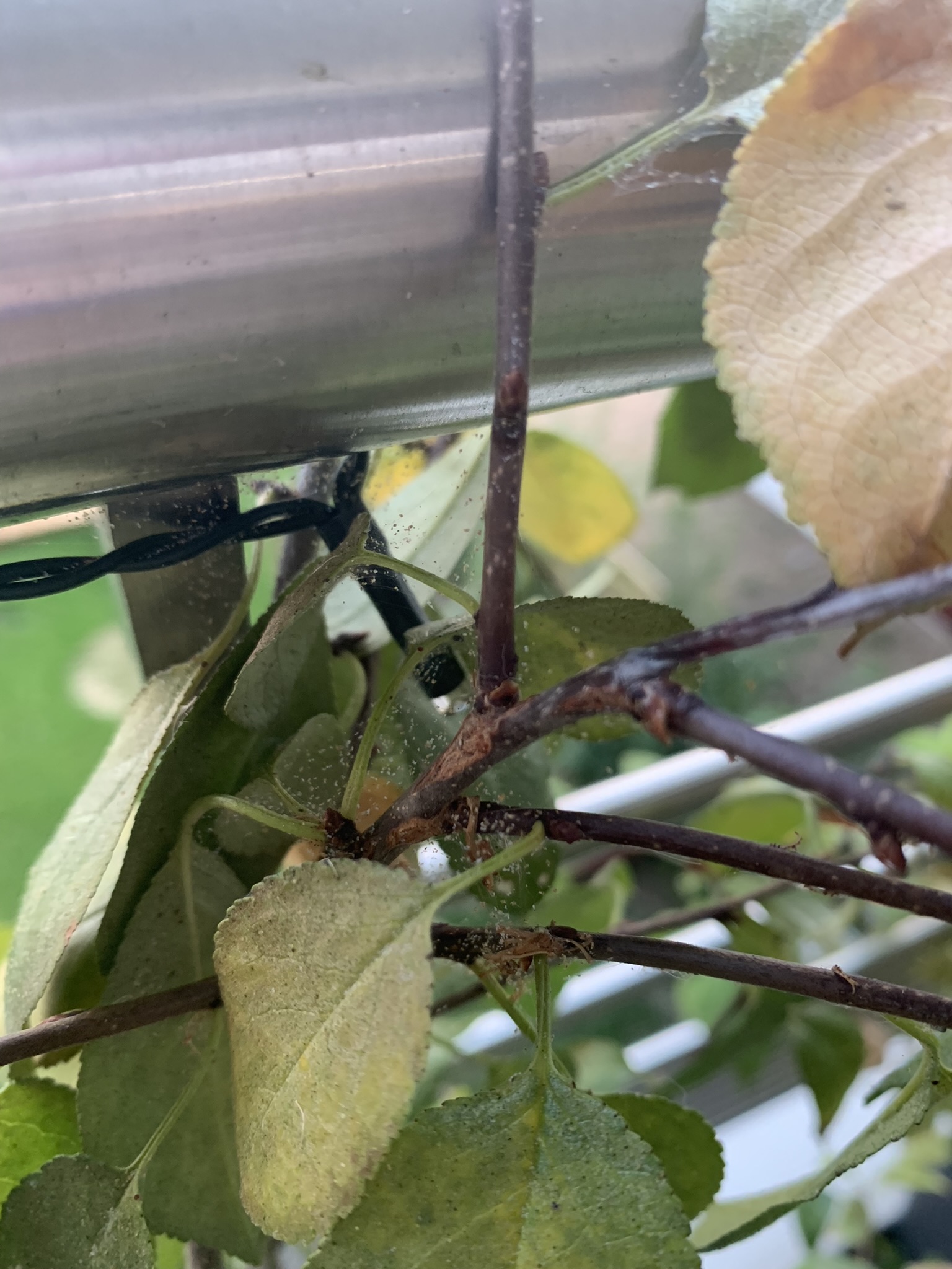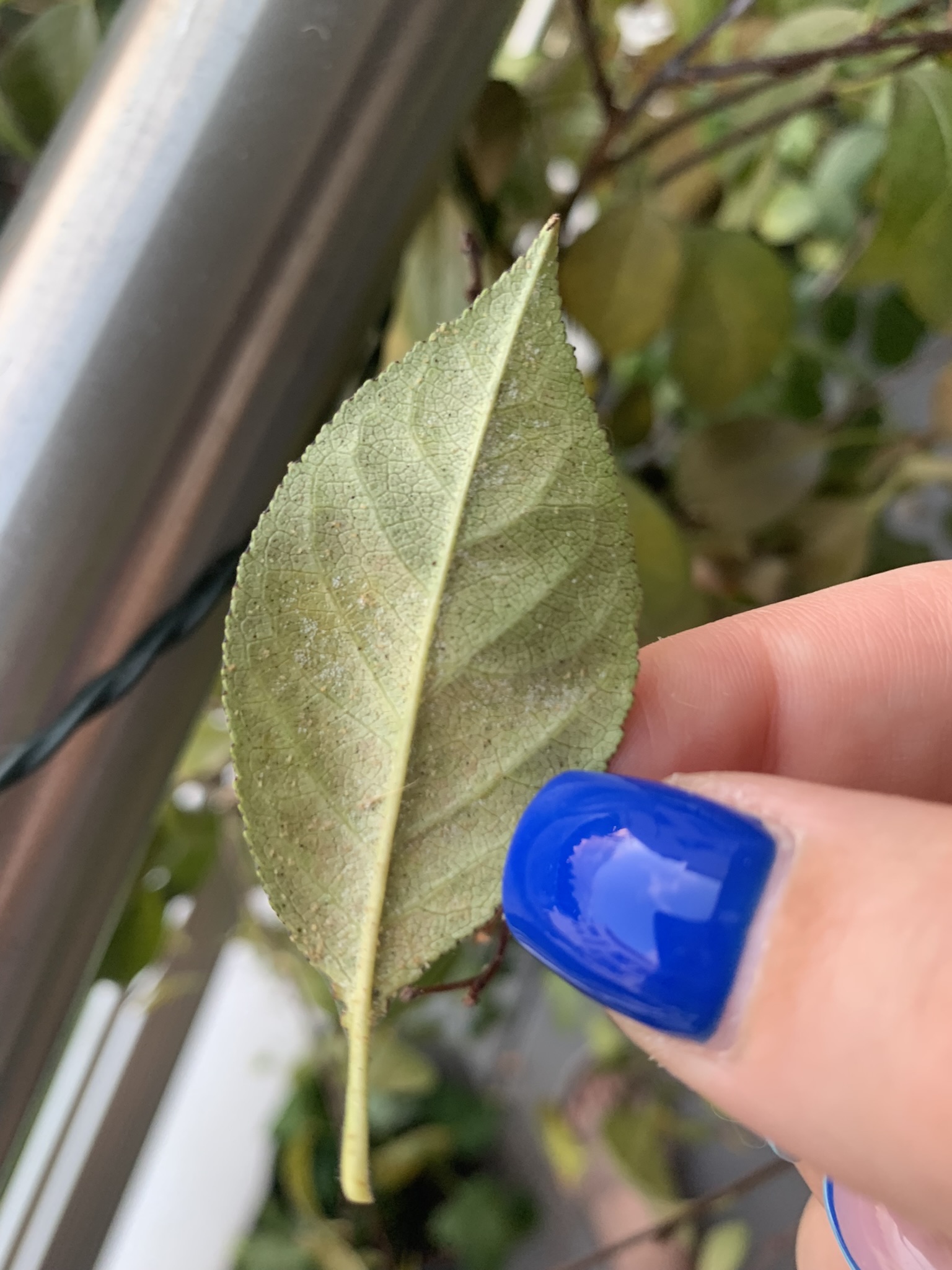 Je viens de remarquer que celui-ci perdait beaucoup ses feuilles. En m’approchant j’ai remarqué qu’il y avait des sortes de toiles entre les branches. J’y vois des insectes blancs et des insectes noirs sur la face arrière des feuilles.