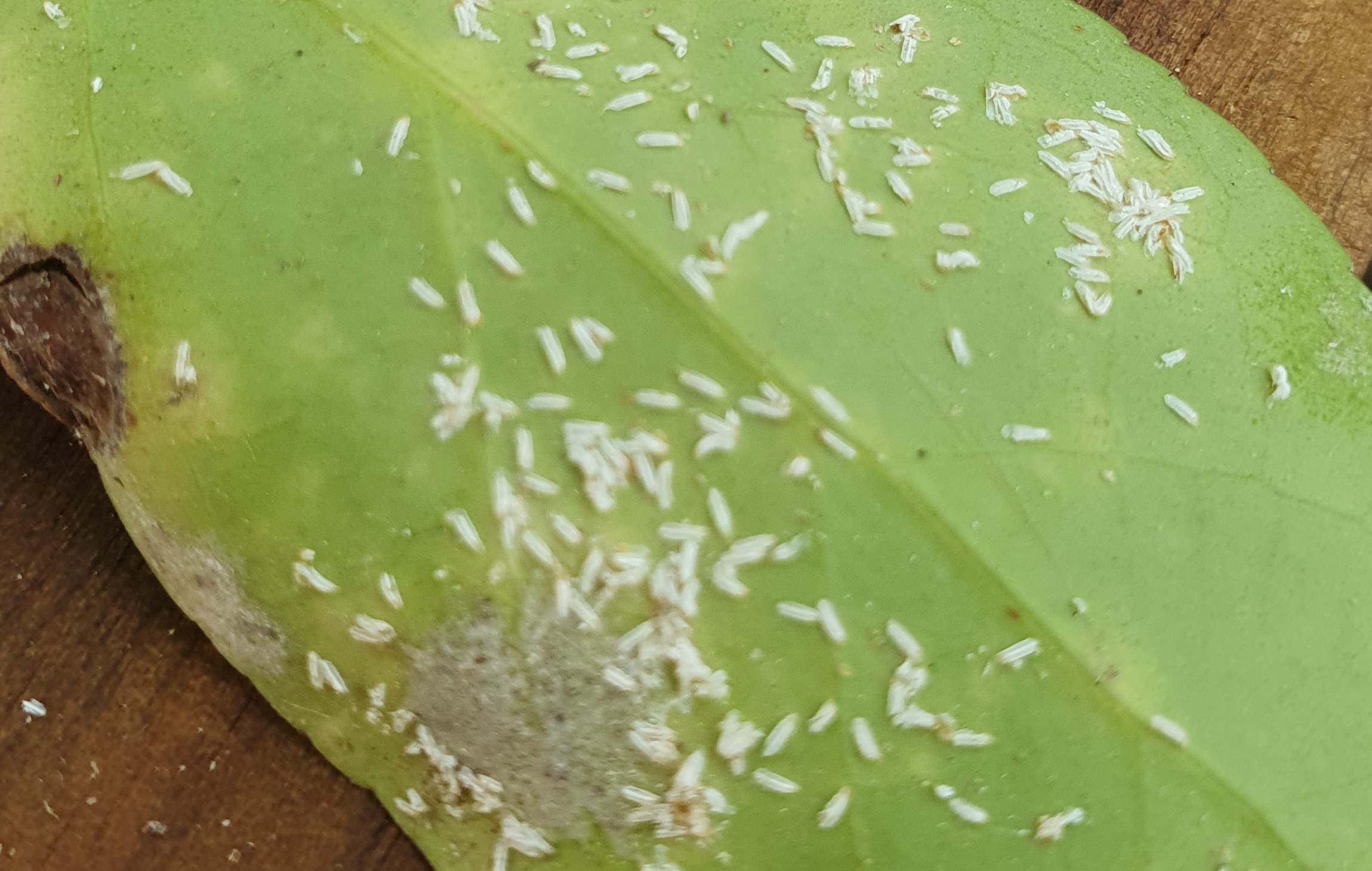 Je viens d'emménager et les arbres du jardin infectés par des petits trucs blancs farineux sous les feuilles. Aucune idée de ce que cela est.