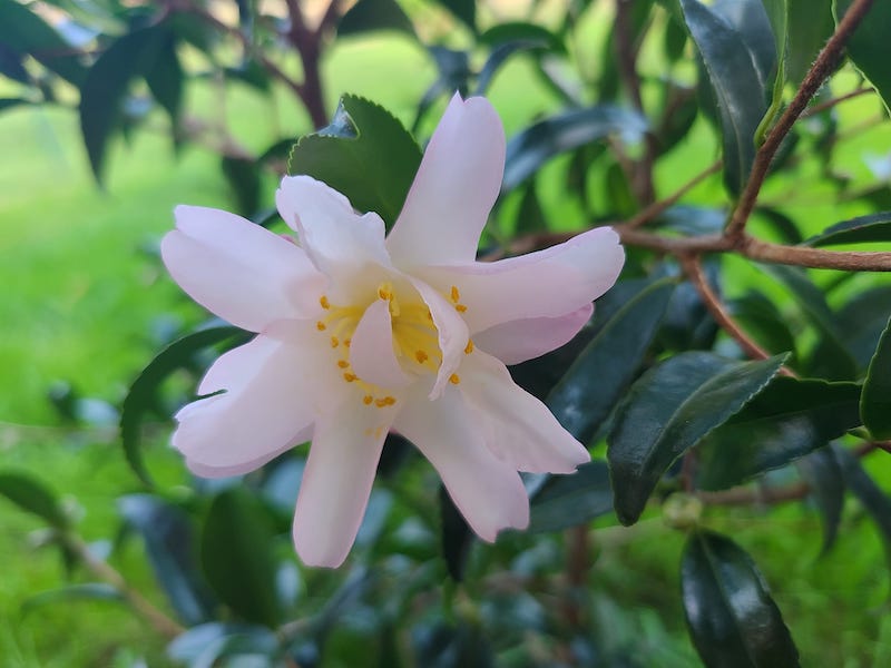 Camélia "Sasanqua Frosted Star" commence sa floraison