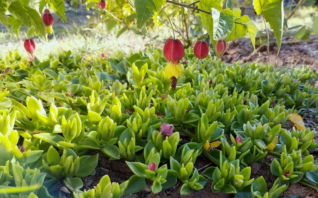 Le tout jeune Abutilon et profitant de son ombre, Aptenia cordifolia. (Seule photo correcte prise avec mon mobile)