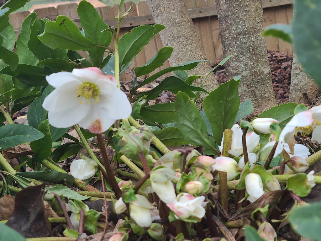 L'hellébore que m'avait offert ma voisine il y a quelques années et que j'ai replanté à un endroit ombragé.