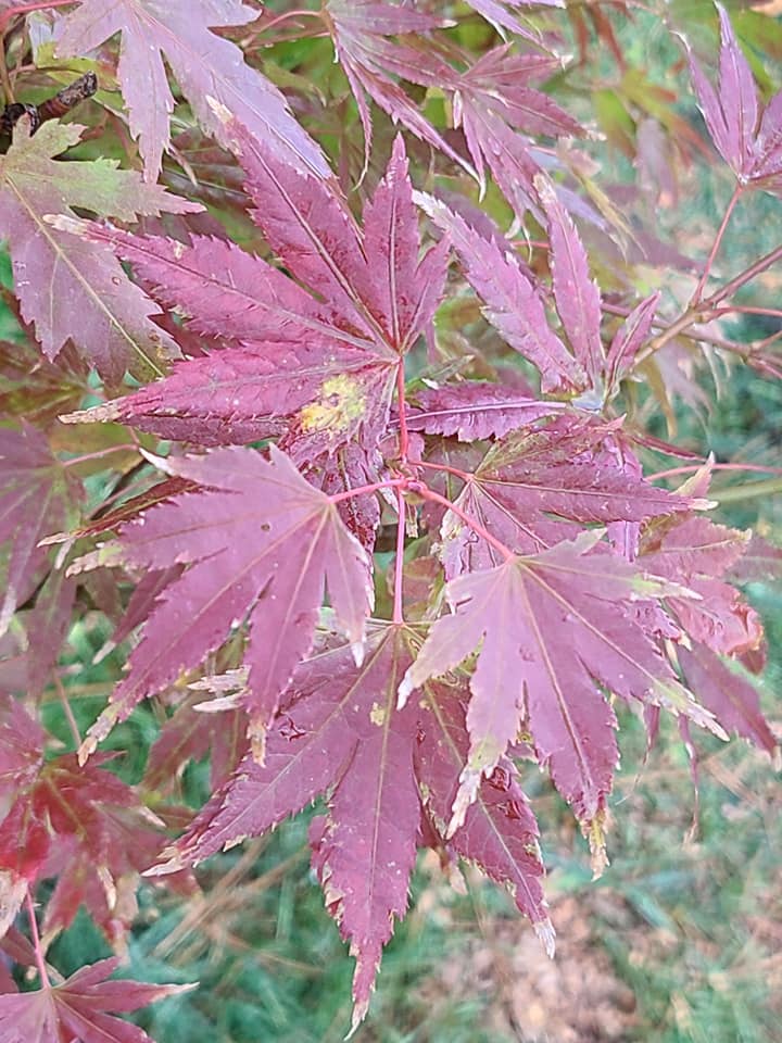 Pour ma par mon palmatum a commencé à pas mal se colorer cette semaine Et je l'ai légèrement palissé, à son achat il était attaché en ligne à un tuteur horzontal à côté d'autres palmatums ce qui ne permettait pas à toutes les branches de se développer normalement Deux petits tuyaux d'irrigation souple de 3mm sur 2 branches et un caillou attaché à une petite branche
