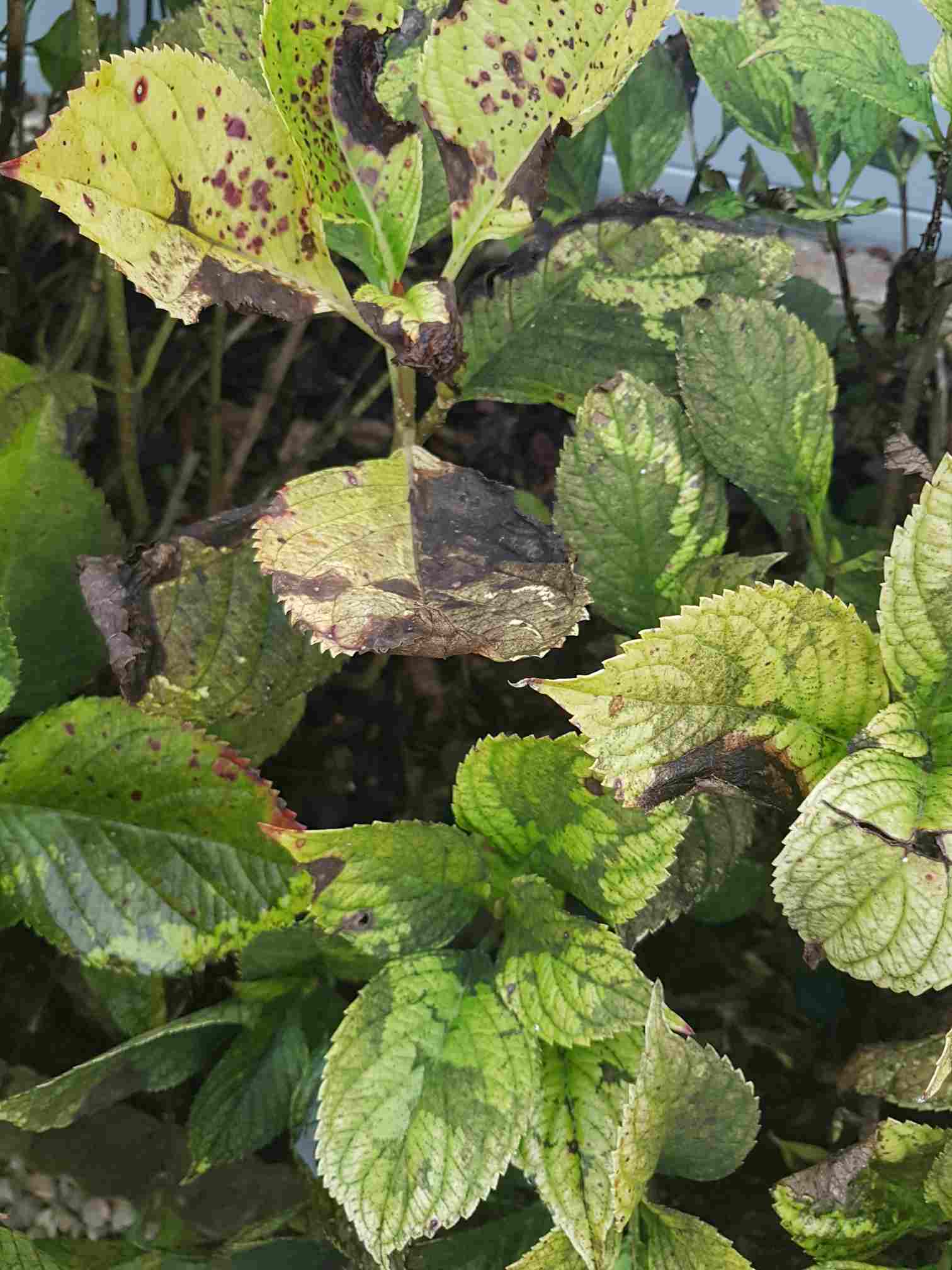 J'aimerais avoir votre avis concernant mes hortensias qui présentent des feuilles tachetées de noir et jaune ainsi que des tiges noircies et avec des dépôts blanchâtres.