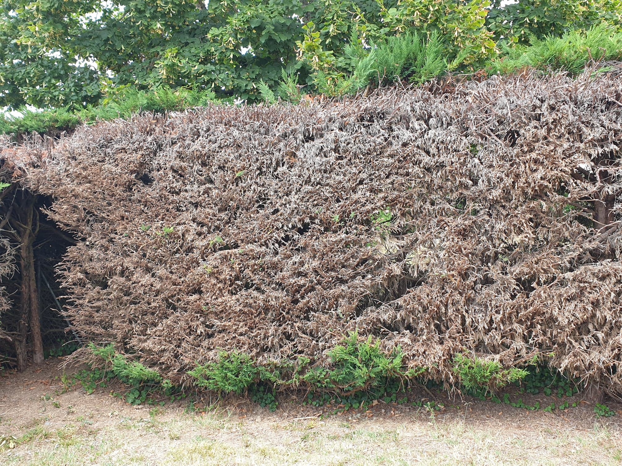 On dirait cependant que la haie est verte au dessus, et du côté extérieur, donc ça a été coupé trop court et trop brutalement.