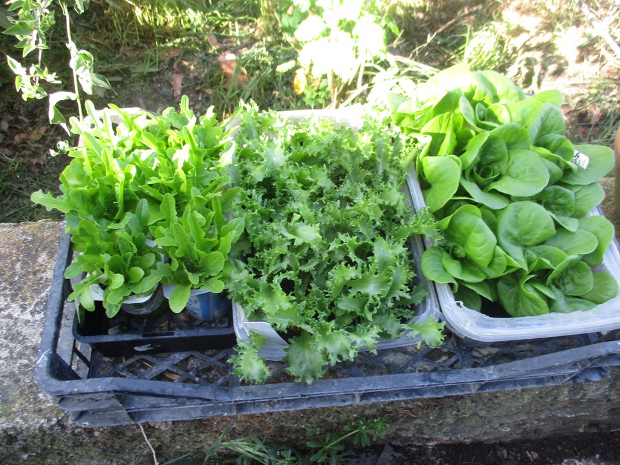 Actuellement j'ai de la mâche prête à monter, de la roquette, scaroles et frisées qui ont duré tout l'hiver sous double voile (je commence par récolter les feuilles du tour, le coeur continue de pousser puis en mars avant qu'elles montent je prends la salade entière) puis persil, poireaux qui ont enfin bien grossi, des blettes et 2 betteraves rouges sous voile