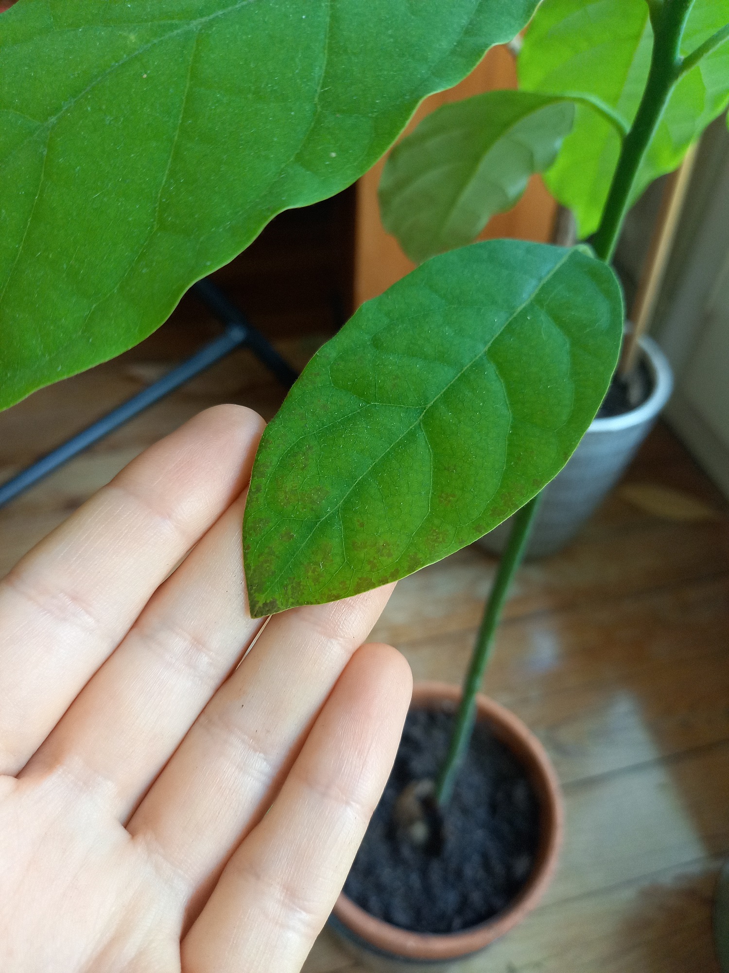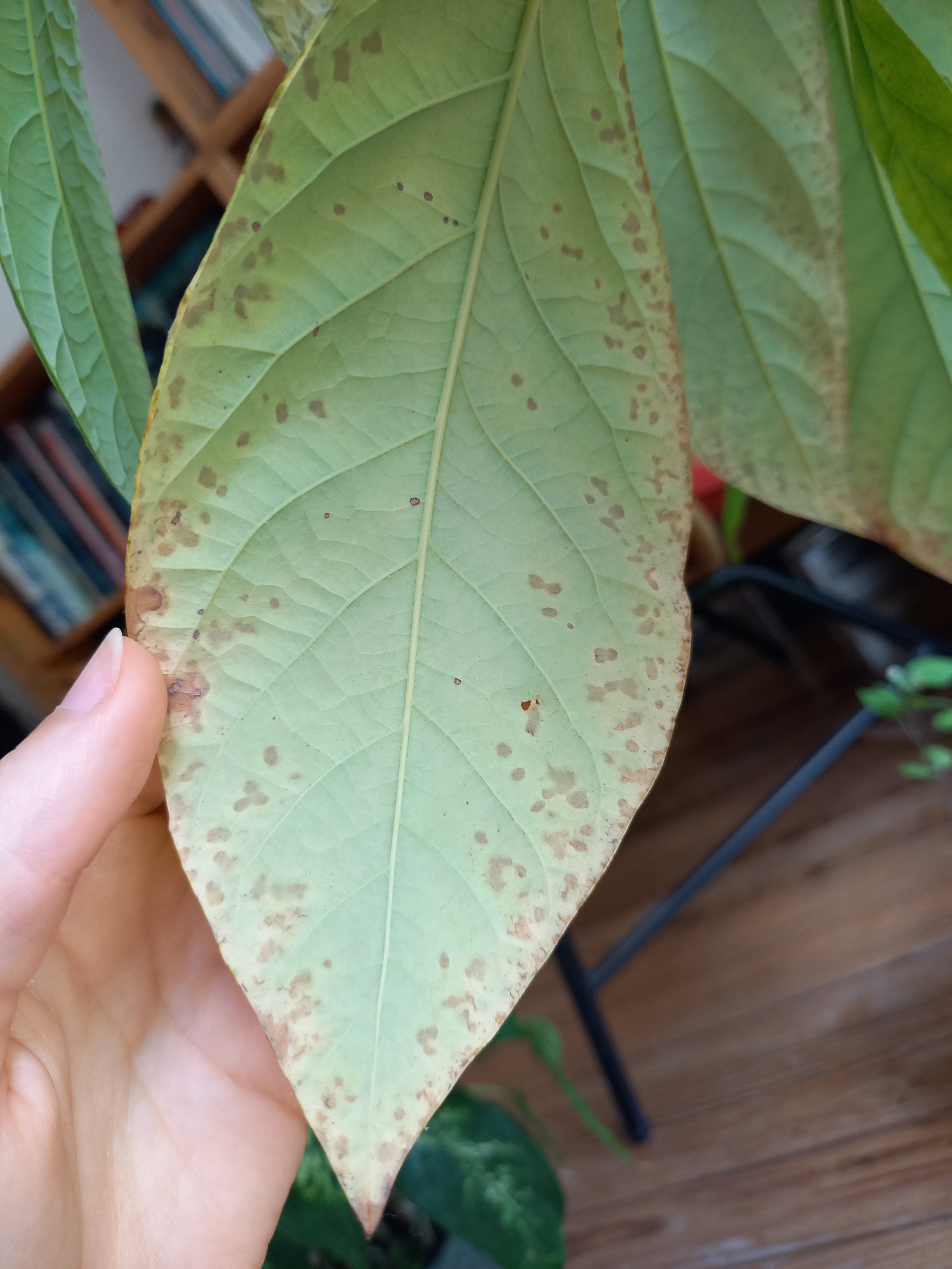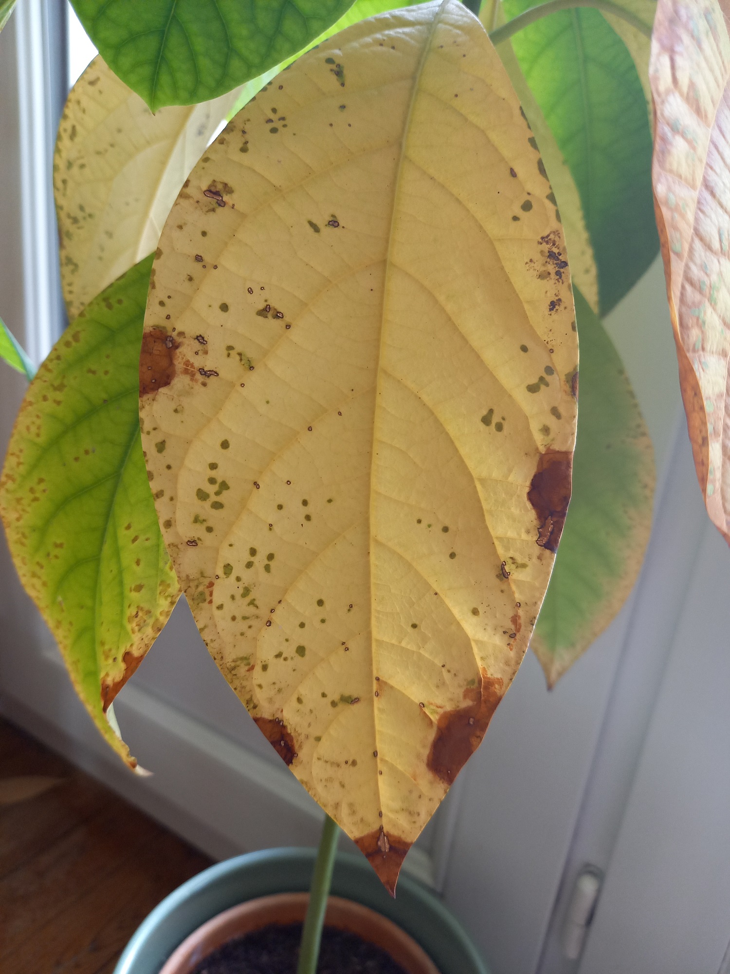 Surtout que depuis quelques jours, mon 2e avocatier, âgé de seulement 5-6 mois, présente lui aussi des taches brunes sur ses feuilles les plus basses. J'espère que ce n'est pas une maladie...