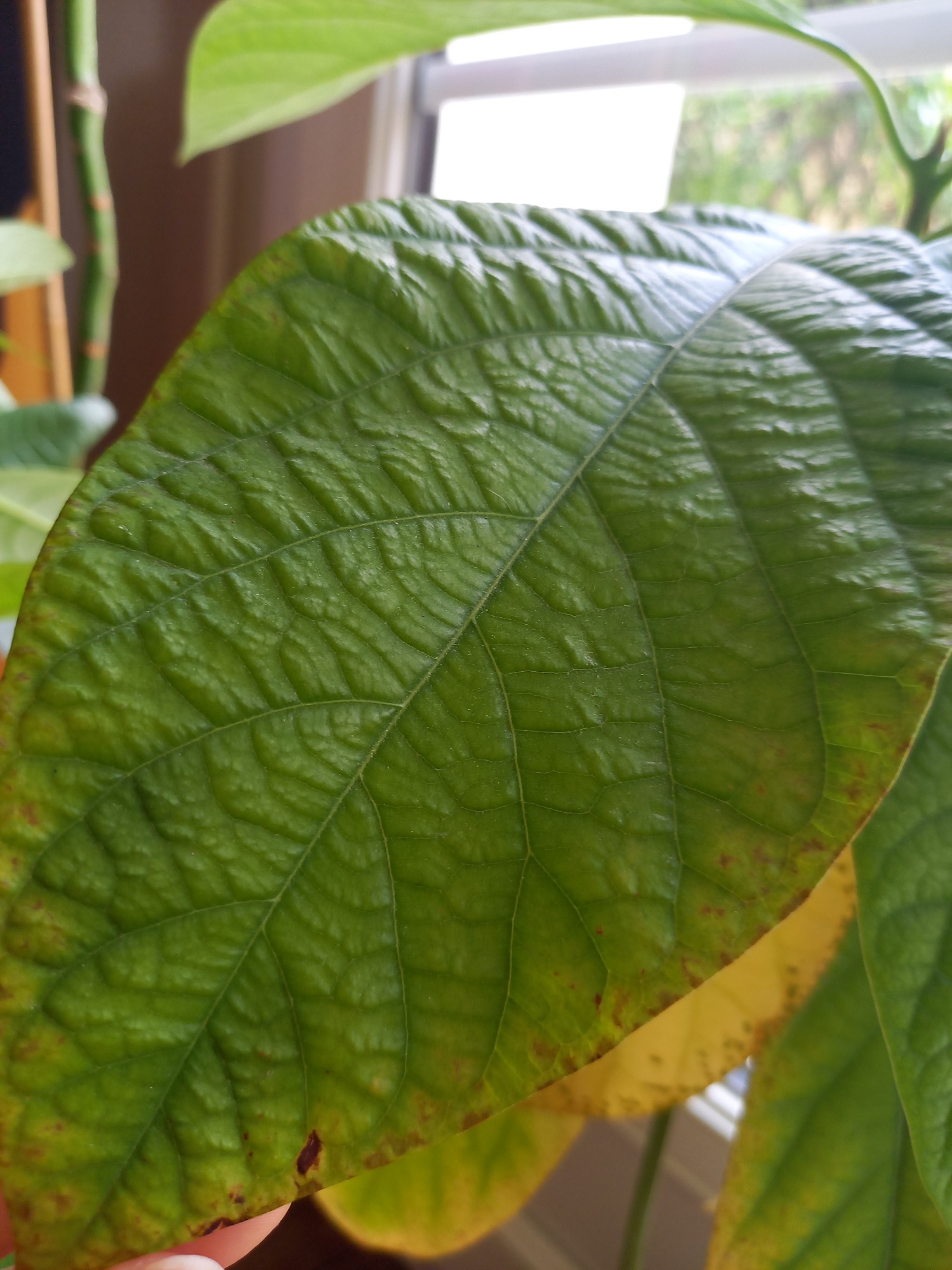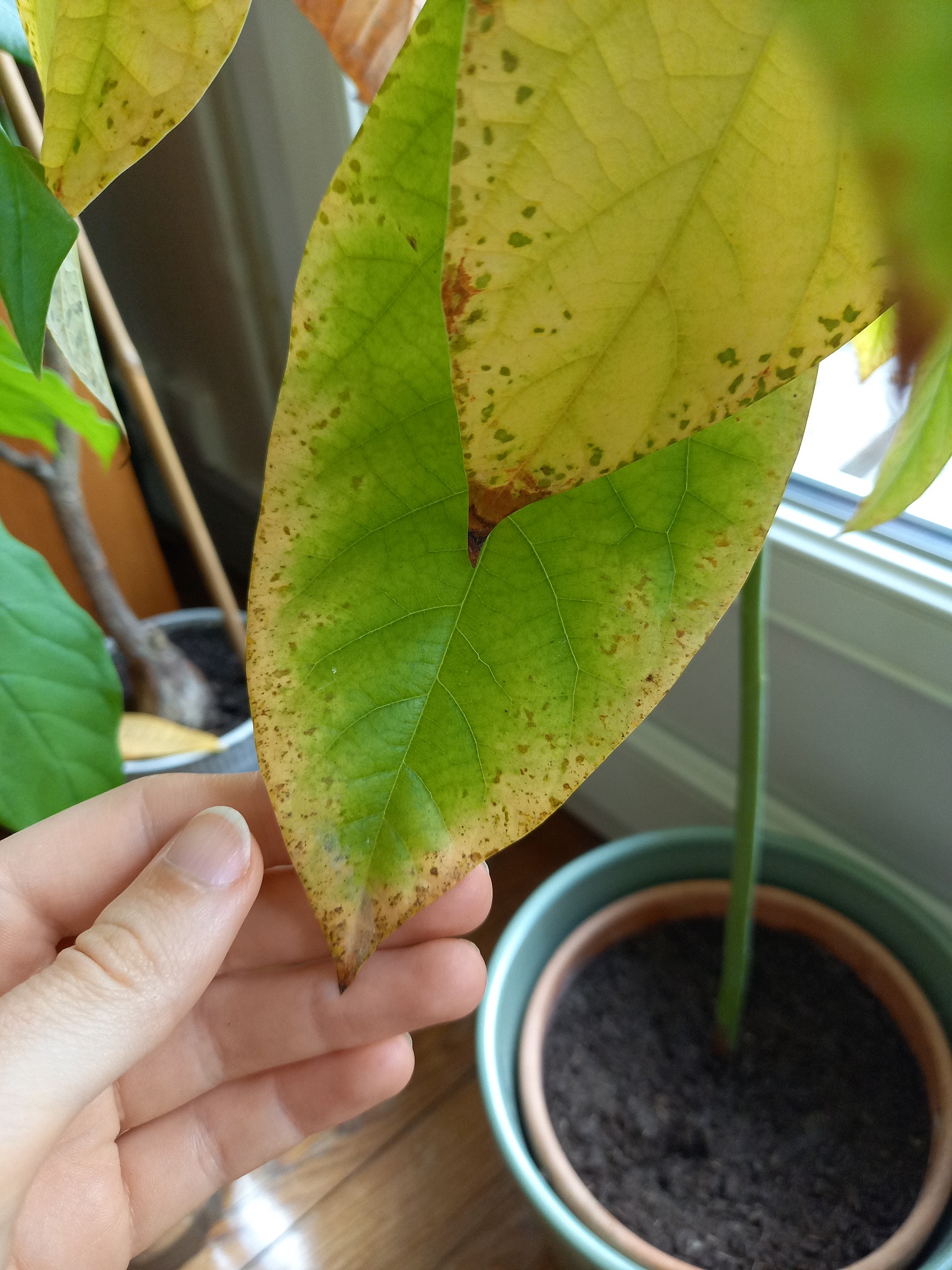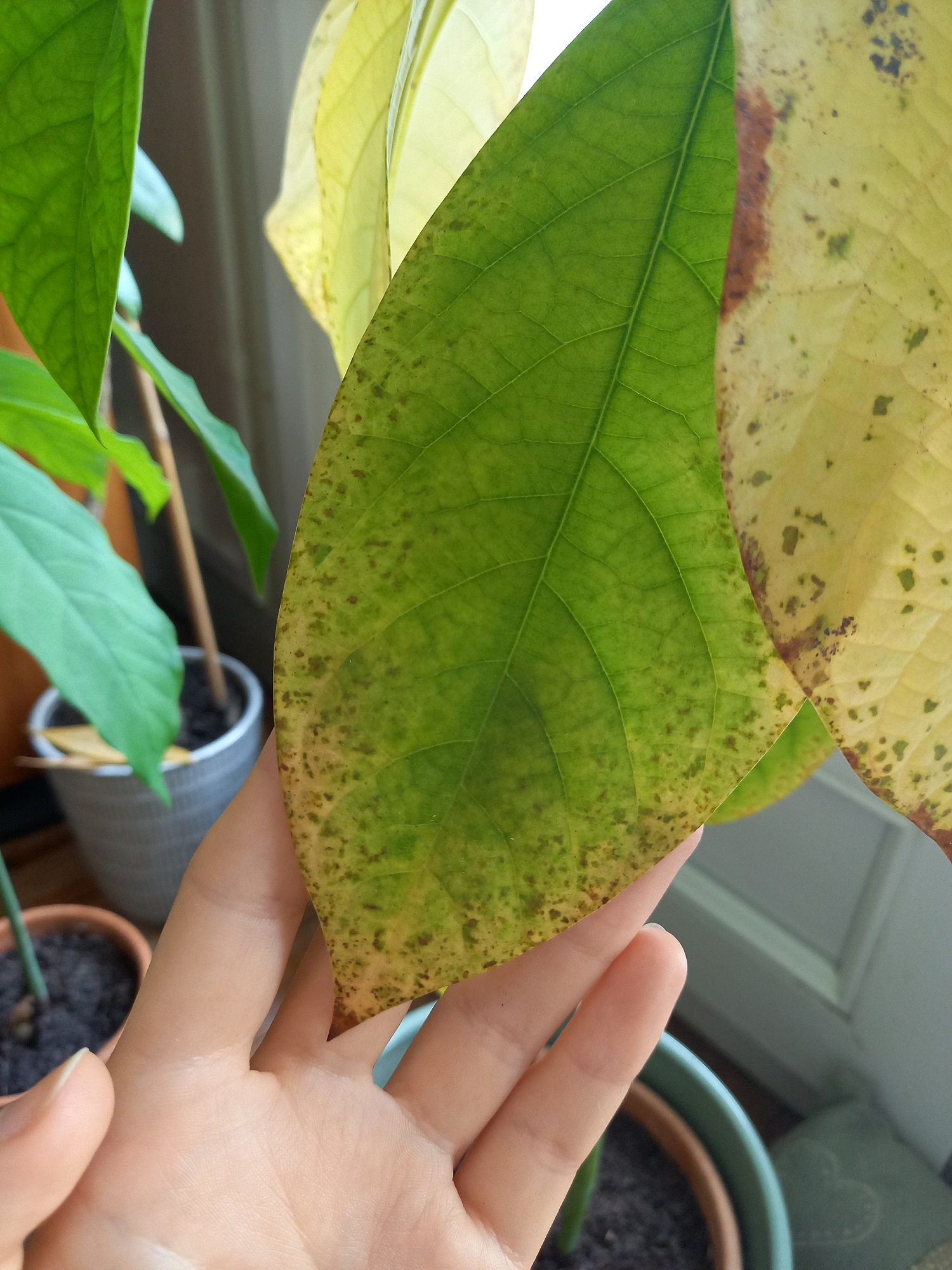 Surtout que depuis quelques jours, mon 2e avocatier, âgé de seulement 5-6 mois, présente lui aussi des taches brunes sur ses feuilles les plus basses. J'espère que ce n'est pas une maladie...