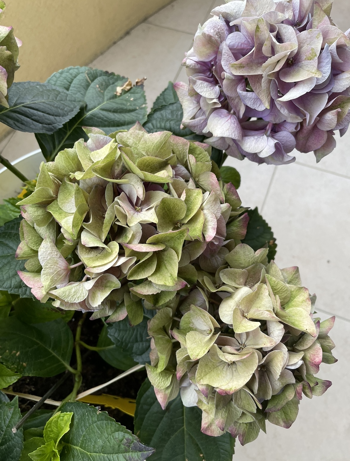 Voilà quelques semaines que mon hortensia a une drôle de tête, les feuilles sont noires au bout et les fleurs ont une couleur complètement passée (voir photos).