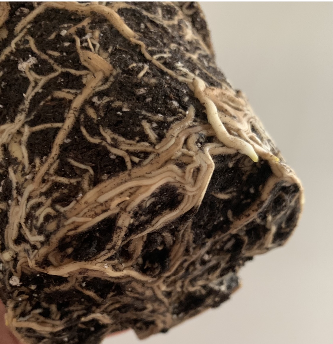 Elles sont tellement serrées et entremêlées au point que les racines ont pris la forme du pot dans le fond