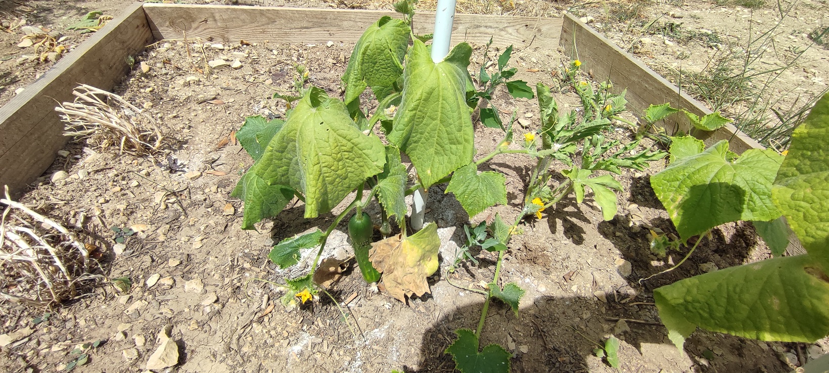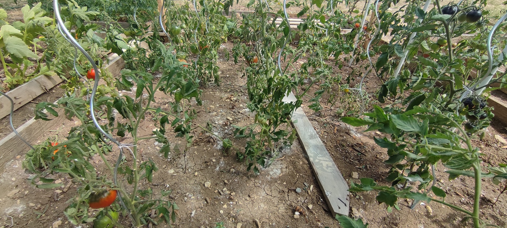 Ton potager meurt de soif. Le plus urgent sarcler entre les pieds puis mettre un paillage : foin ou paille puis arroser sérieusement