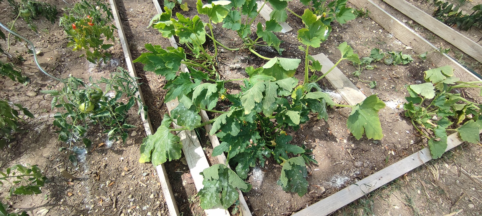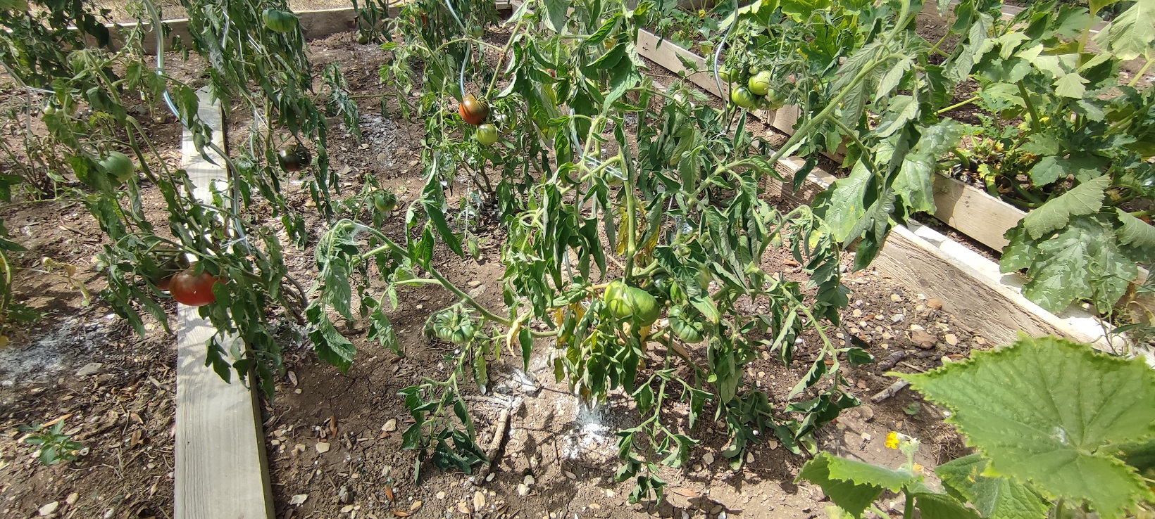 Il est évident que ton potager meurt de soif. 2 litres d'eau par plant tous les deux ou trois jours n'apportent absolument rien comme hydratation.