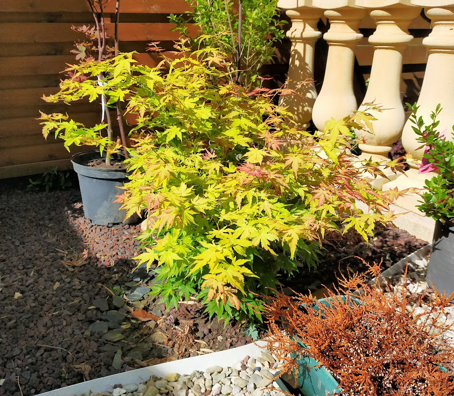 Je joins des photos pour illustrer : l'érable du Japon quand tout allait bien, puis après la 1ère brûlure, puis après la taille.