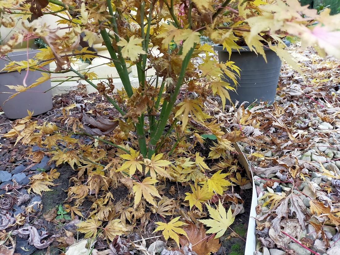 De plus nous avons plusieurs végétaux touchés ainsi (2 bacs de framboisier, un bac de passiflore et, très peu, les fèves de touchés par le même phénomène, tous avec le broyat), et tous présentent des symptômes similaires. Pour cet érable du Japon, J'avais taillé les feuilles endommagées (que le haut initialement) mais hélas le reste a suivi après cela ...