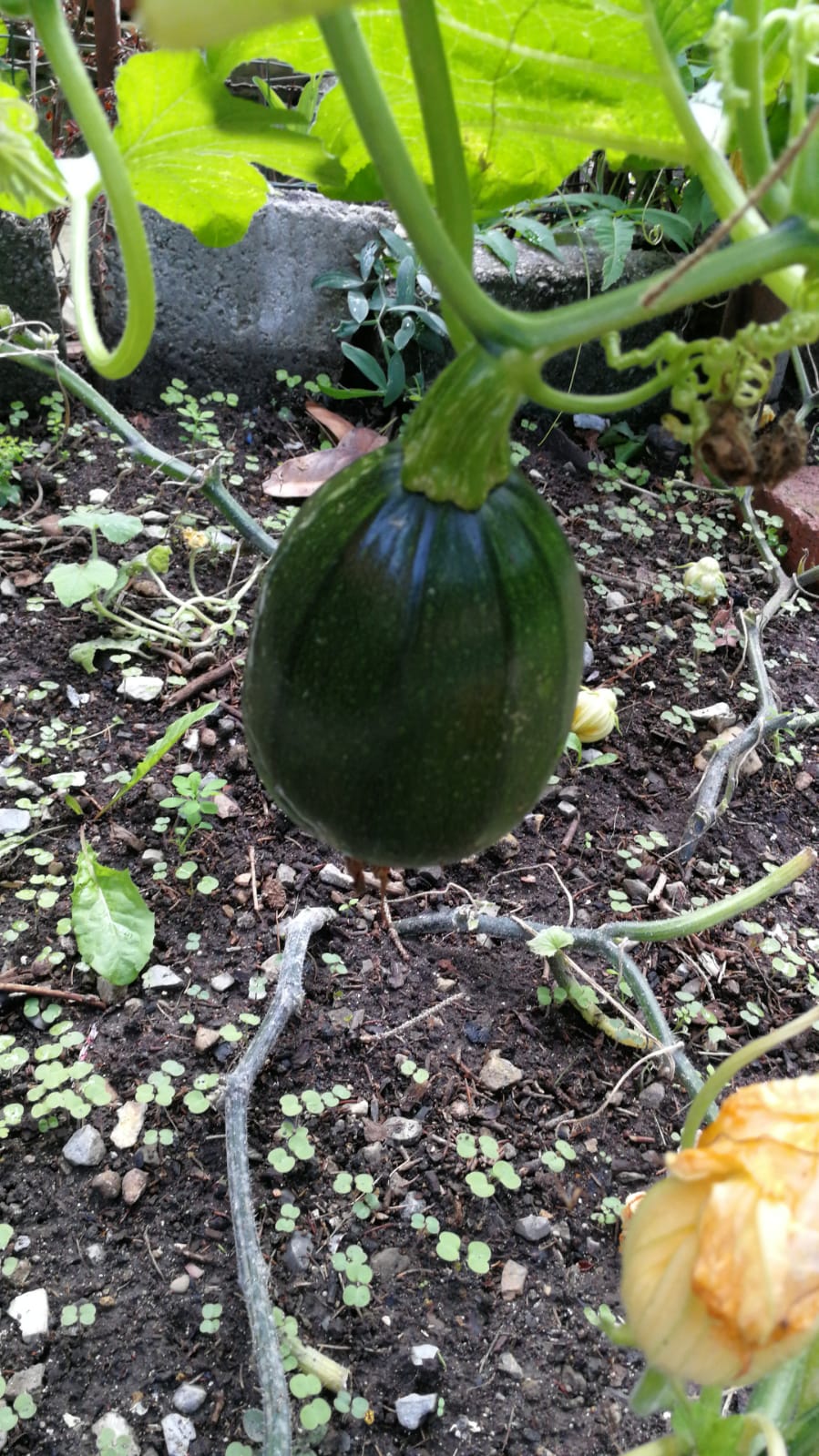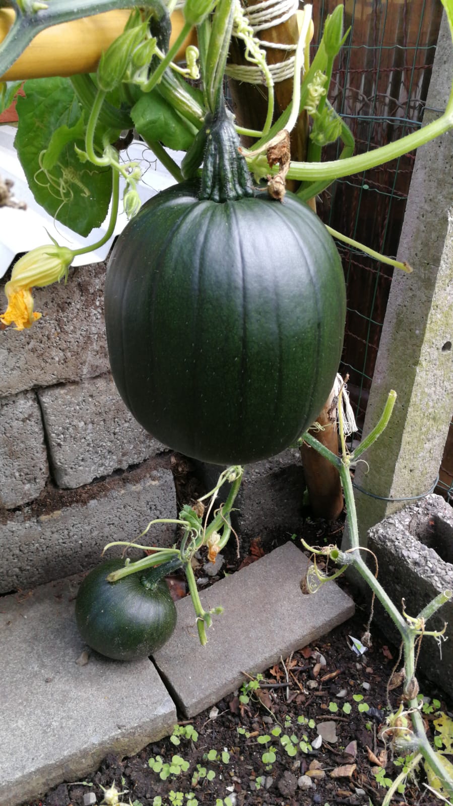 Je n'ai rien planté à cet endroit, mais j'avais balancé des graines d'un potimarron acheté au supermarché en 2021, dans mon compost juste à côté. En 2022 j'ai eu un pied de potimarron. J'ai à nouveau jeté les graines dans mon compost. Et cette année j'ai donc des pieds et ces fameux fruits verts.