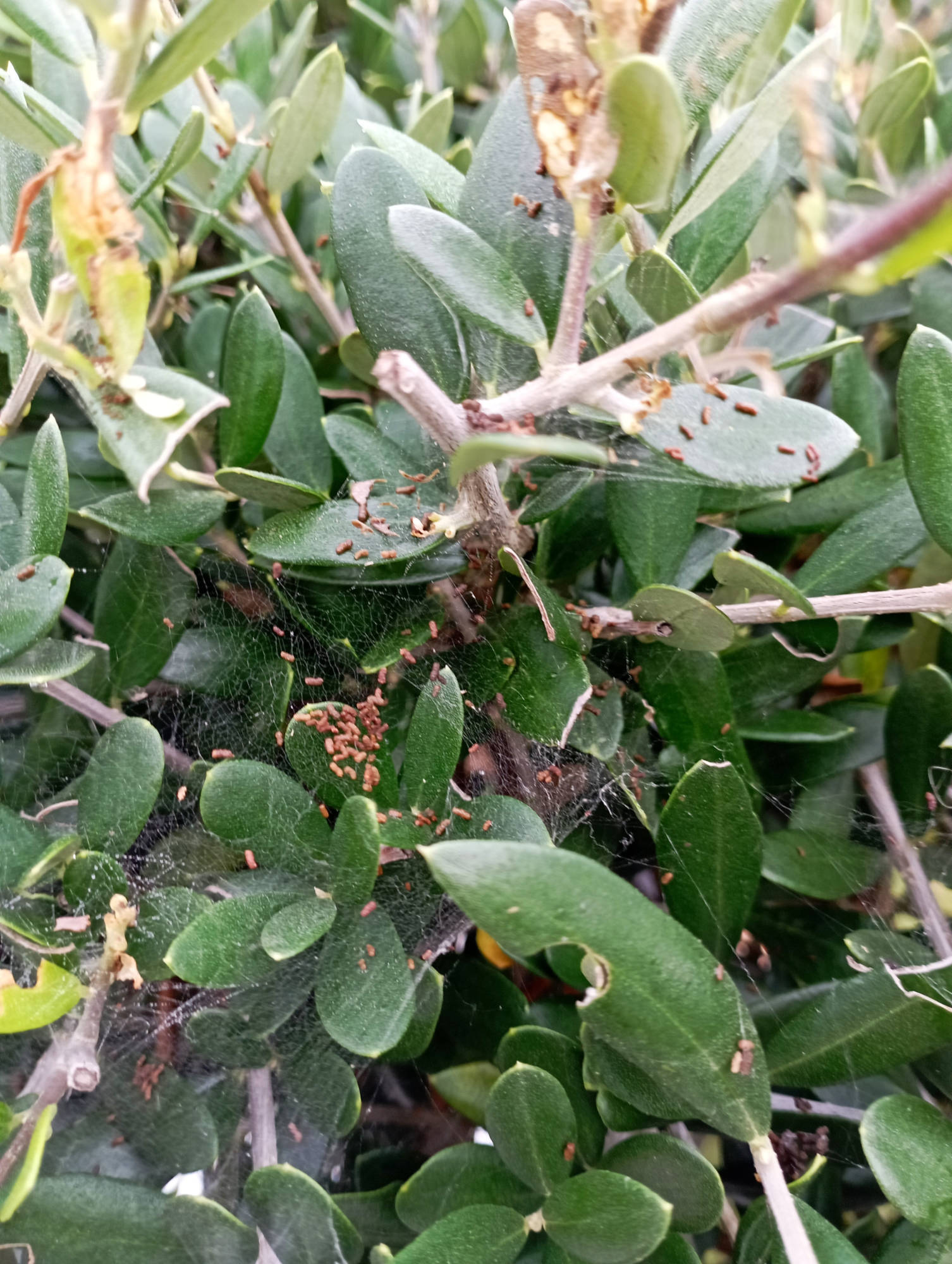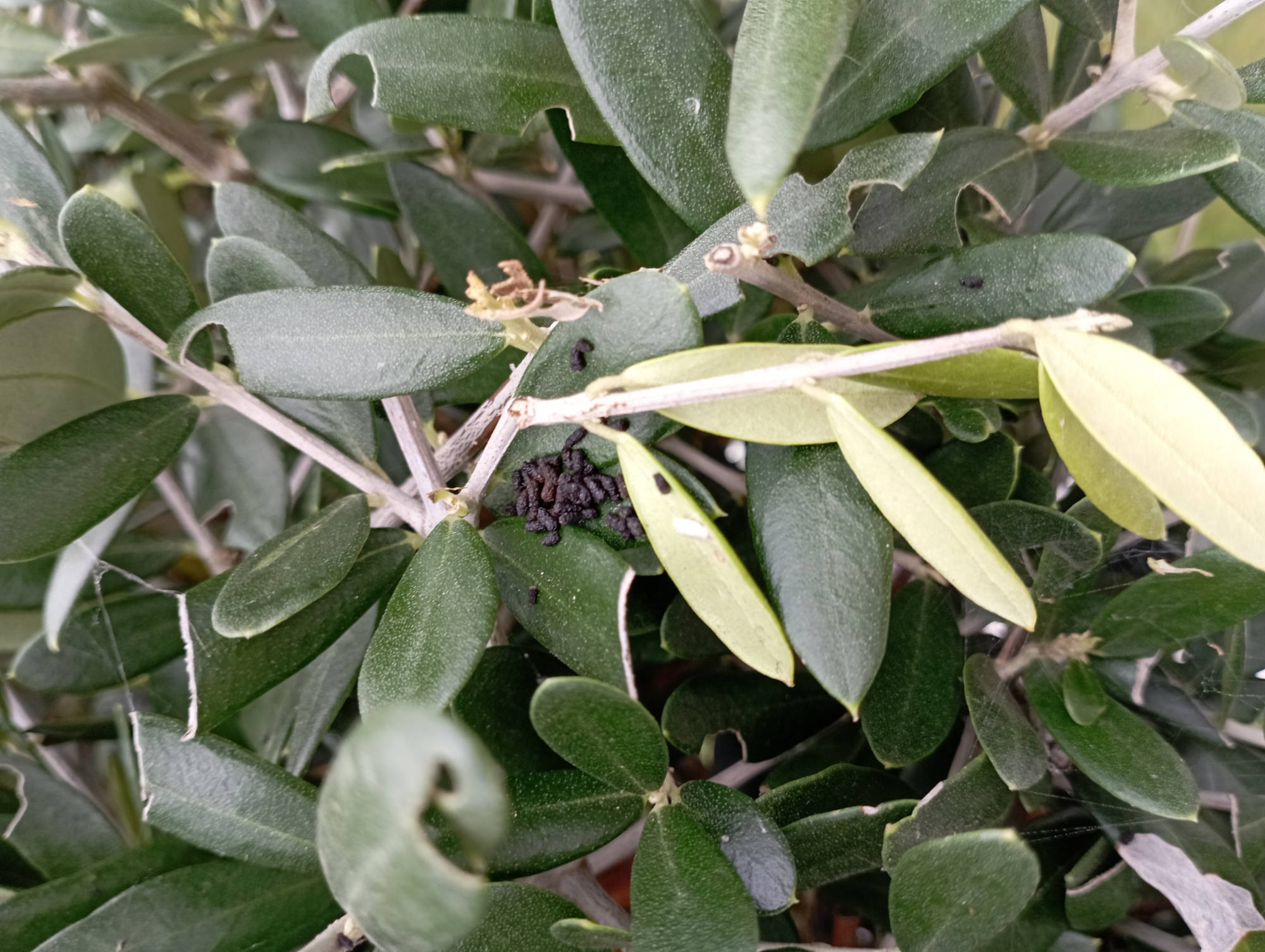 Il semble attaqué par la psylle de l'olivier., et des acariens (petites toiles)