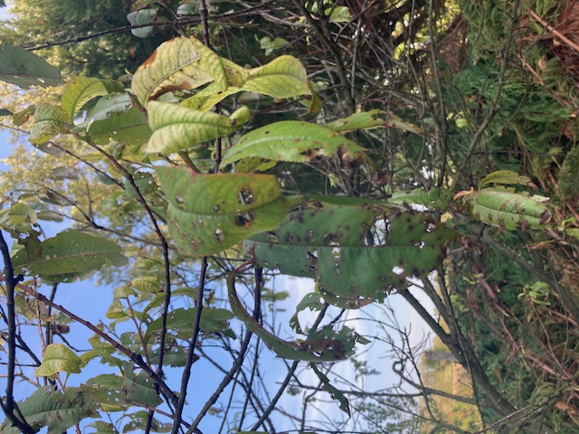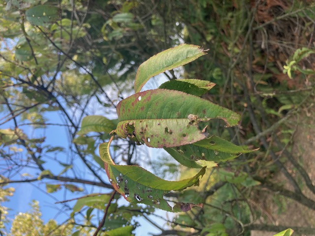 Par contre il y a plusieurs cause à l'apparition de "trous" sur les feuilles : ce peut-être d'origine fongique (et c'est pas très grave, ce sera juste préjudiciables les années humides, c'est probablement ce qu'à votre arbre), ou bactérienne (là c'est moins rigolo en revanche). Pas facile de faire l'identification à cette époque.
