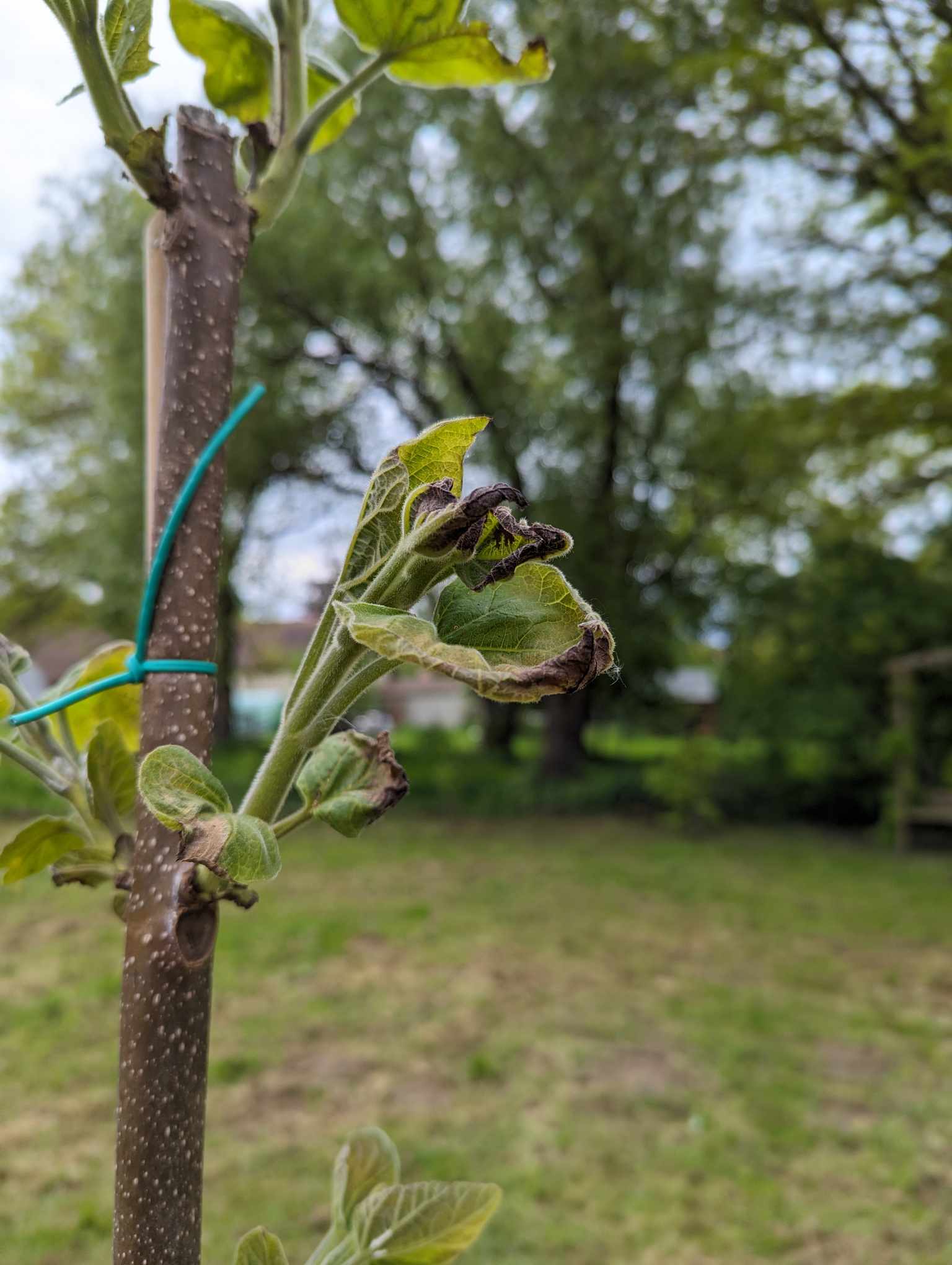 Paulownia tomentosa n°2 (actuel) : planté en automne 2023 (un peu plus loin que le trou du premier sujet), il a bien repris en ce printemps 2024 avec une croissance assez vigoureuse (même plus que le premier sujet) malgré la saison (exceptionnellement humide et fraîche cette année chez moi). Sauf que depuis 3-4 jours : rebelotte, je constate avec amertume que les feuilles commencent à noircir de la même façon que pour le premier sujet.