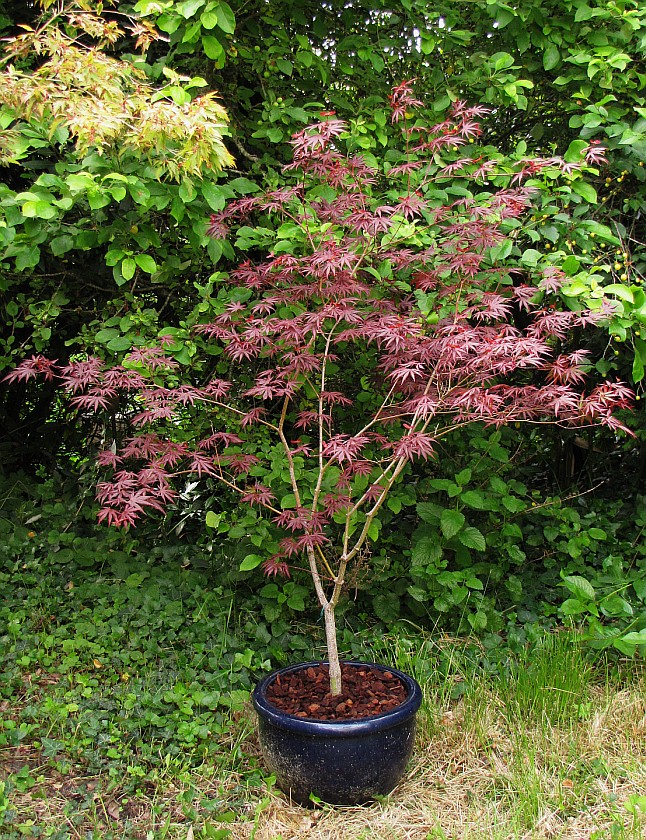 Acer ‘phoenix en 17 ans de pot perd son débourrement rouge fluo . J’ai rabattu le-mien et rempoté en réduisant les racines début mars. Il a retrouvé un peu de couleur au débourrement. 18° année taillé court à 70 cm. Sur la photo jointe il fait, pousses comprise 90 cm de haut.