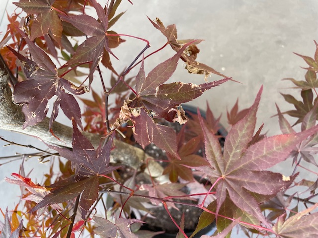 Je me permets une dernière question, savez vous pourquoi les feuilles de mon Bloodgood s’abîment de la sorte ? Chaleur (j’en doute) ? Trop plein d’eau ou pas assez ? Pluie ? Elles se recroquevillent par endroit aussi. Faut il tailler ces feuilles ?