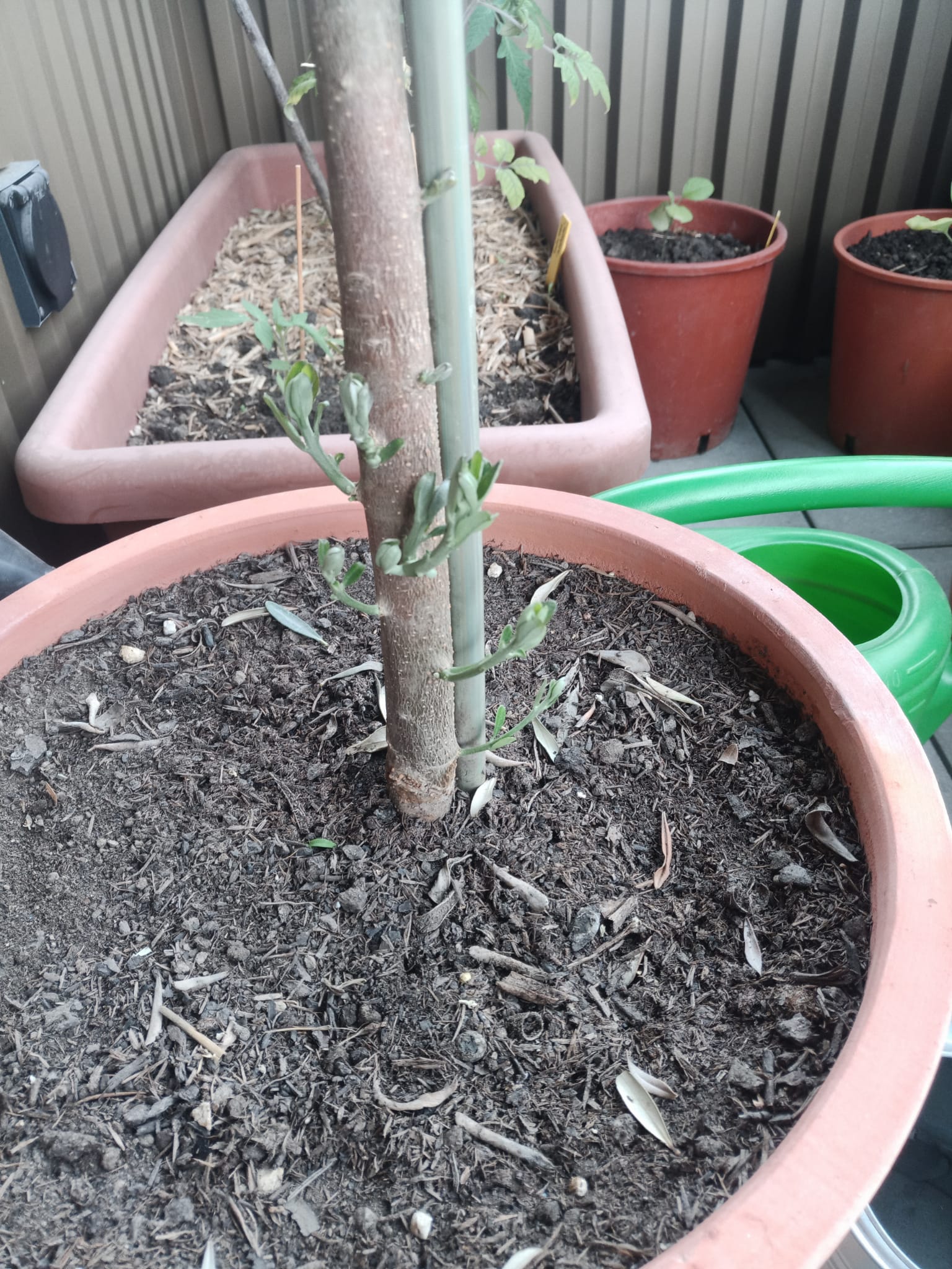 Mais j'ai peur que ce printemps, au moment d'une gelée tardive, mon olivier n'ait pas aimé le froid (pourtant pot emballé et protégé par le faitage du toit). Ses feuilles se sont petit à petit recroquevillées et sont devenues brunes et sèches. Environ un mois après ce coup de gel, plusieurs rejets sont repartis de la base du tronc, mais pas le houppier principal, hormis quelques très rares feuilles sur 1-2 rameaux.