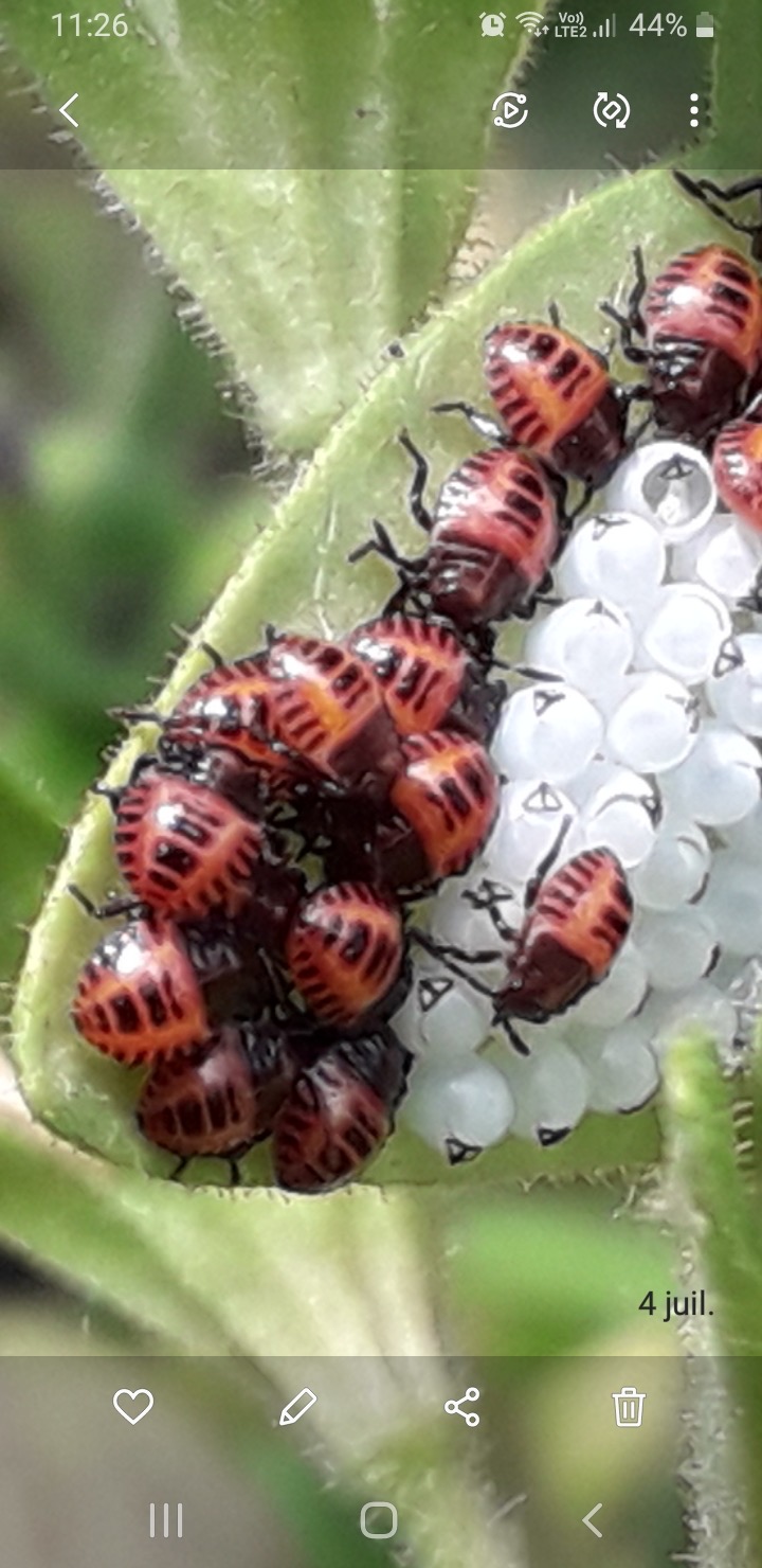 Bonjour, j’ai découvert ces tout petits œufs entourés par les petits insectes qui sont nés tout autour d’eux au revers d’une feuille de pétunia. Connaissez-vous ces insectes, sont ils dangereux ? Merci à vous.