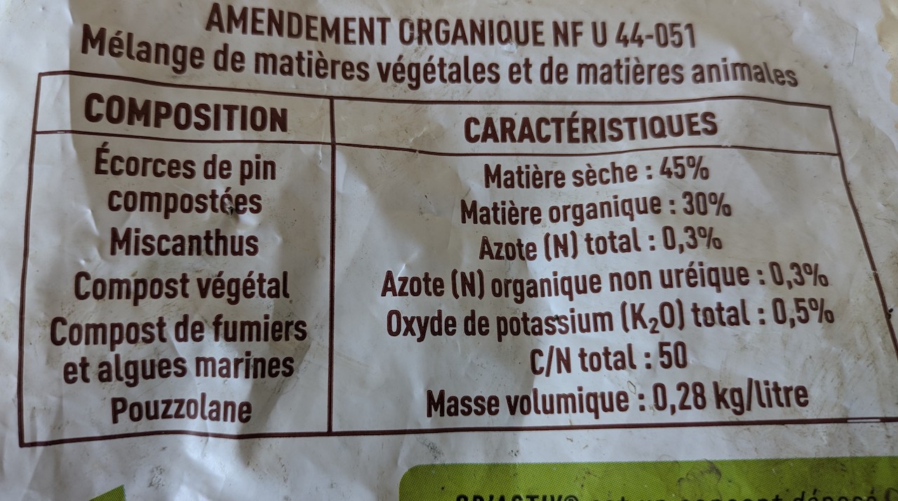 1--l’écorce de pin compostée (broyée fine 1cm environ pour petits pots et plus grosse pour grands pots et conteneurs).