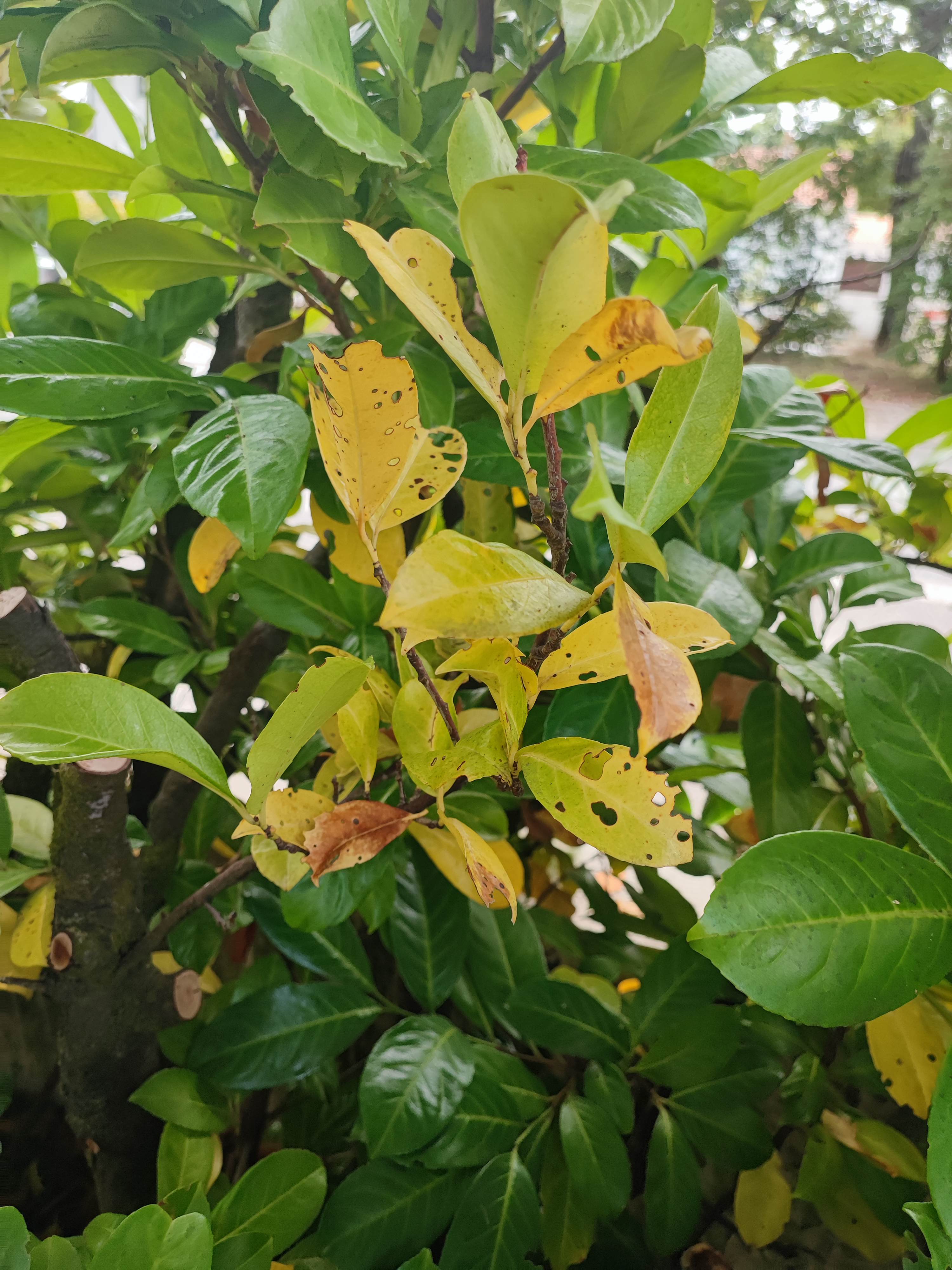 J'avais remarqué que depuis quelques que certaines feuilles de mes lauriers palmes jaunissaient. J'avais attribué ça a la chaleur. Mais le phénomène s'est accéléré et les feuilles semblent comme grignotées par endroit.