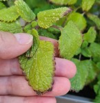 j'ai des melisses en pot que j'ai achetées cette année et replantées. Depuis quelques temps les feuilles deviennent noires au bout et sont toutes violette en dessous et elles ont des petits points blancs. Elles sont exposées plein soleil et arrosées tous les soirs. Le sol est drainé j'ai mis des billes lors du rempotage et lespots sont percés donc pas de stockage d'eau dans les pots. Que puis-je faire pour elles ?