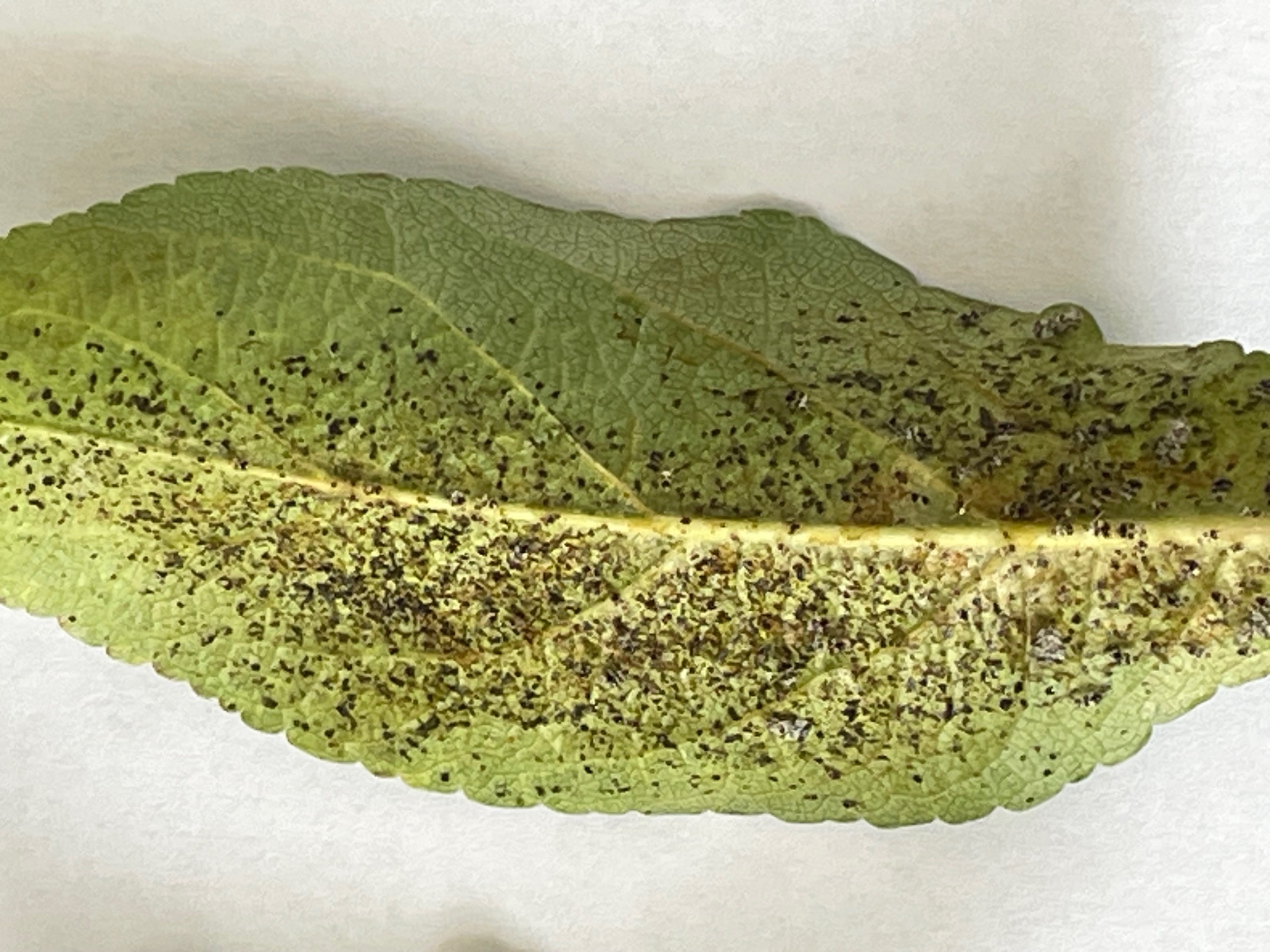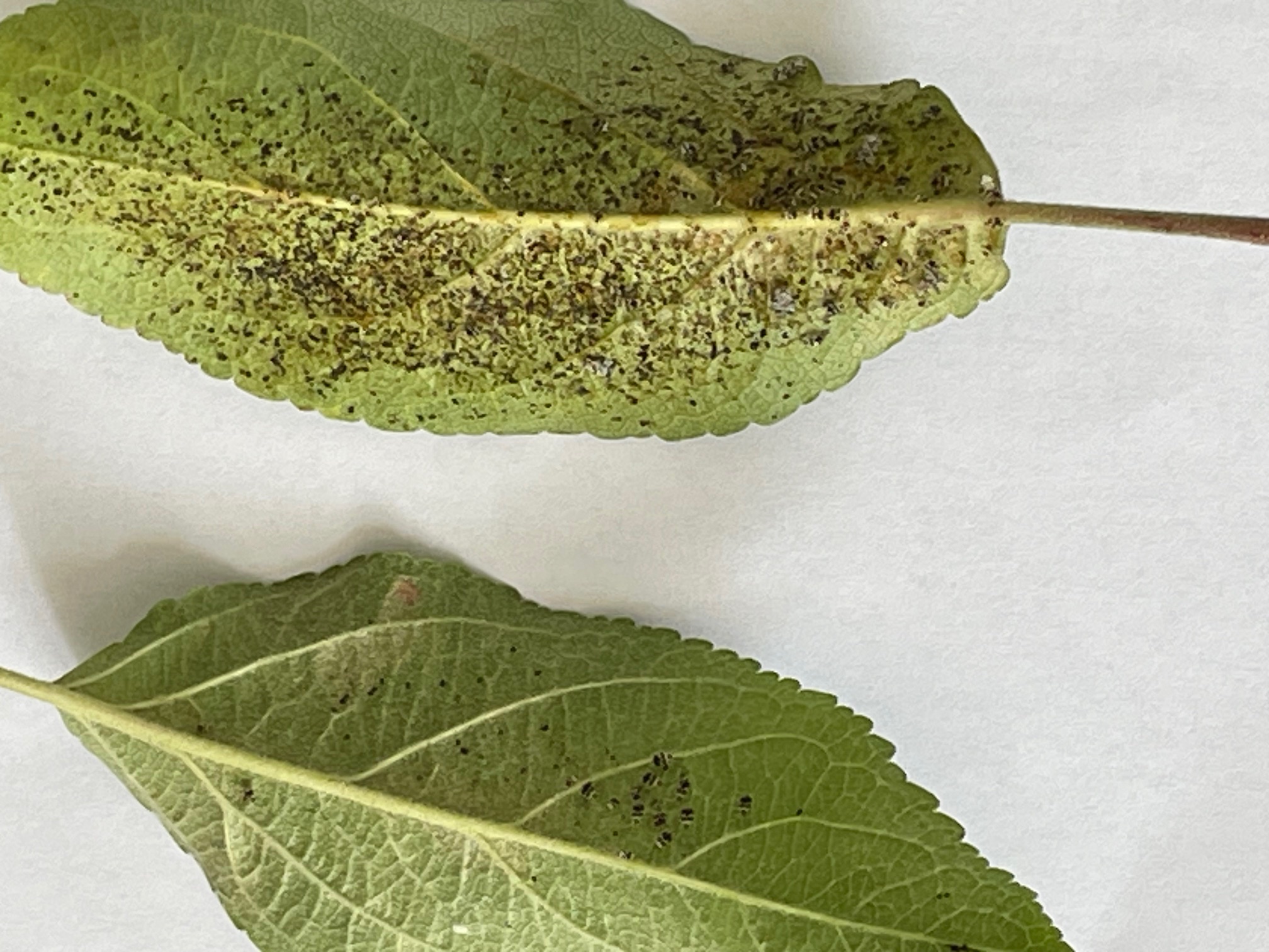J'ai constaté sur certaines feuilles de mon pommier nain une décoloration sur le devant de la feuille, en les retournant je me suis aperçu qu'elles présentaient pleins de petits points noirs.