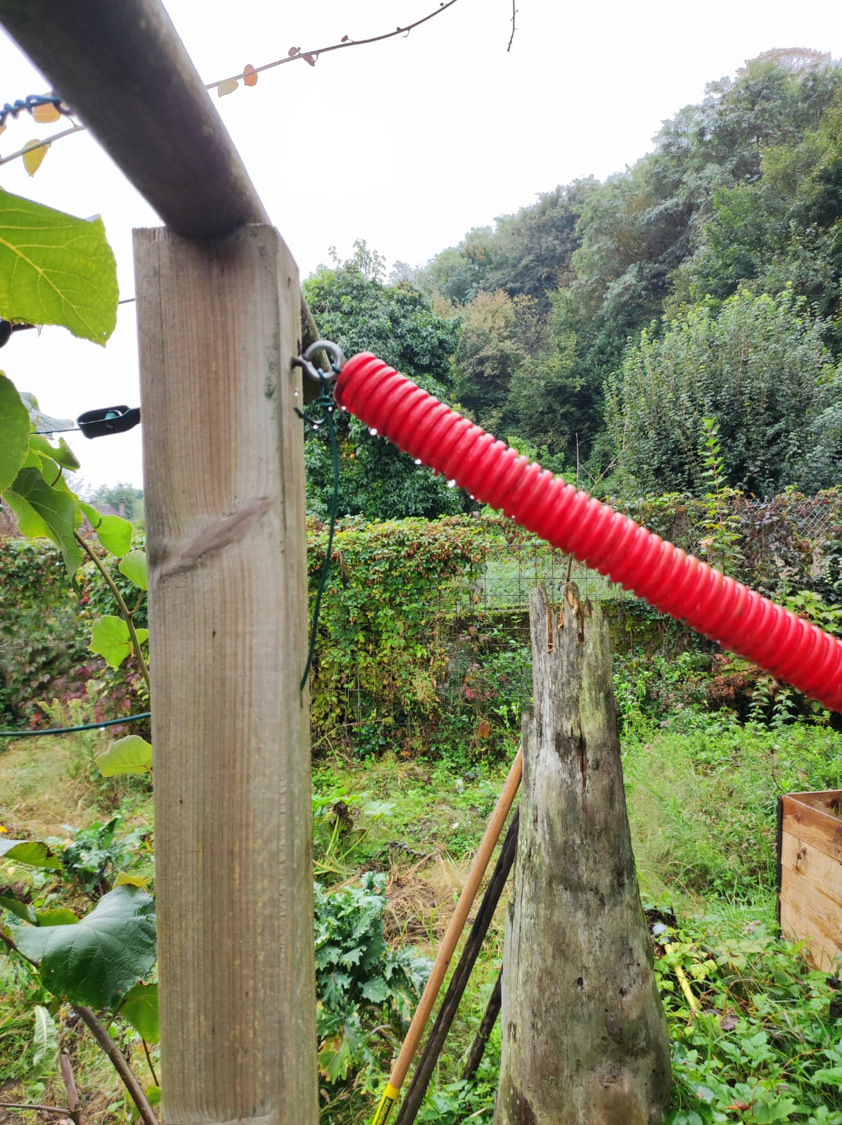 plus récents (semés en 2018) pas le même système mais ça tient et ça va tenir dans le temps, à chaque extrémité le fil est passé dans une gaine rouge pour pas qu'on se le prenne dans la figure en passant :