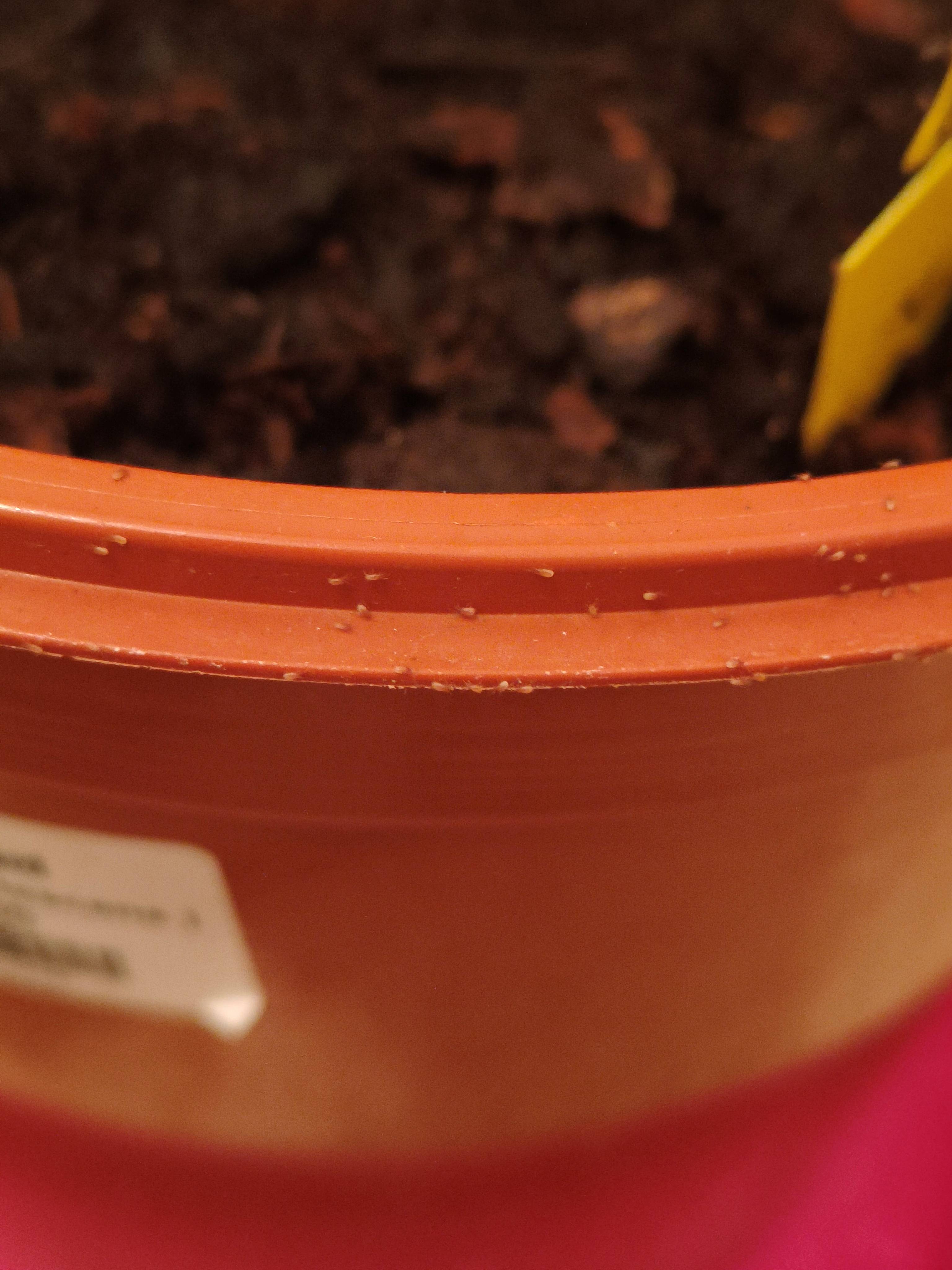 Et aujourd'hui, donc plusieurs jours après, des minuscules (<1mm) insectes blanc avec des petites antennes sont apparus dans la terre de certaines d'entre elles.