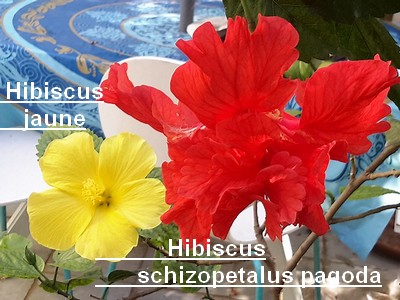 Hibiscus schizopetalus lanterne japonaise et hibiscus jaune simple