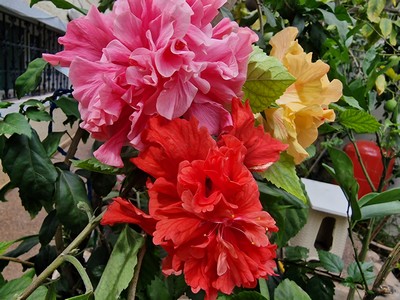 Hibiscus à fleurs triples/ Jaune-orange, rouge et rose. C'est rare ou trois fleurs s'ouvrent durant la même période.