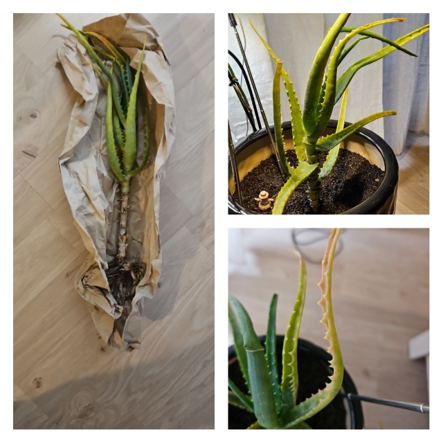 J'ai reçu cet aloe vendredi en cadeau dans une commande ; normalement ils envoient une bouture, mais j'ai reçu ce monstre 😅 il a Ă©tĂ© rempotĂ© dans de la terre Ă  cactĂ©e la journĂ©e mĂȘme (le temps d'aller acheter un pot aux bonnes dimensions), et comme j'imagine que sa couleur palote est dĂ»e au fait qu'il est restĂ© trop longtemps dans un entrepĂŽt plutĂŽt qu'Ă  un excĂšs d'arrosage j'ai ressorti une petite lampe (surtout que mon logement n'est pas trĂšs lumineux, surtout Ă  cette saison). Mais j'ai tout de mĂȘme des questions, notamment je me demande si je dois l'arroser ou attendre une semaine ou deux, et Ă©galement, j'ai un engrais foliaire dans mon placard, est-ce que ça l'aiderait Ă  bien prendre racine ou au contraire est-ce que je lui fiche la paix pour l'instant ? Merci d'avance Ă  ceux qui auront une idĂ©e sur le sujet â˜ș