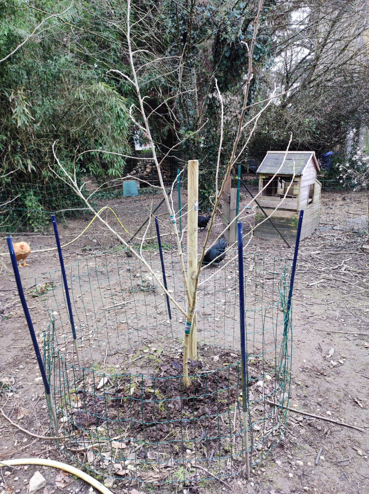 @domf avec le grillage ce n'est pas idéal, les poules ne peuvent pas accéder aux fruits tombés au centre, et si j'enlève le grillage elles vont manger les fruits pas mûrs et les feuilles, c'est pas top