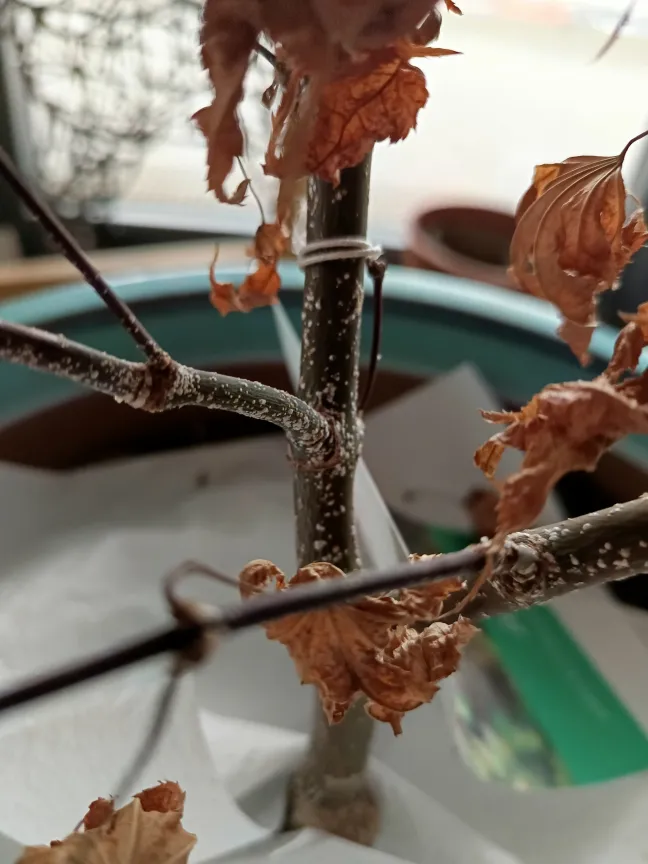 Cochenilles farineuses : elles laissent des amas blancs cotonneux, parfois collés très fort à l’écorce. Elles se nourrissent de la sève de l’arbre. En les écrasant avec un sopalin humide, tu fais déjà un bon premier nettoyage, mais elles ont souvent des œufs bien cachés dans les crevasses…