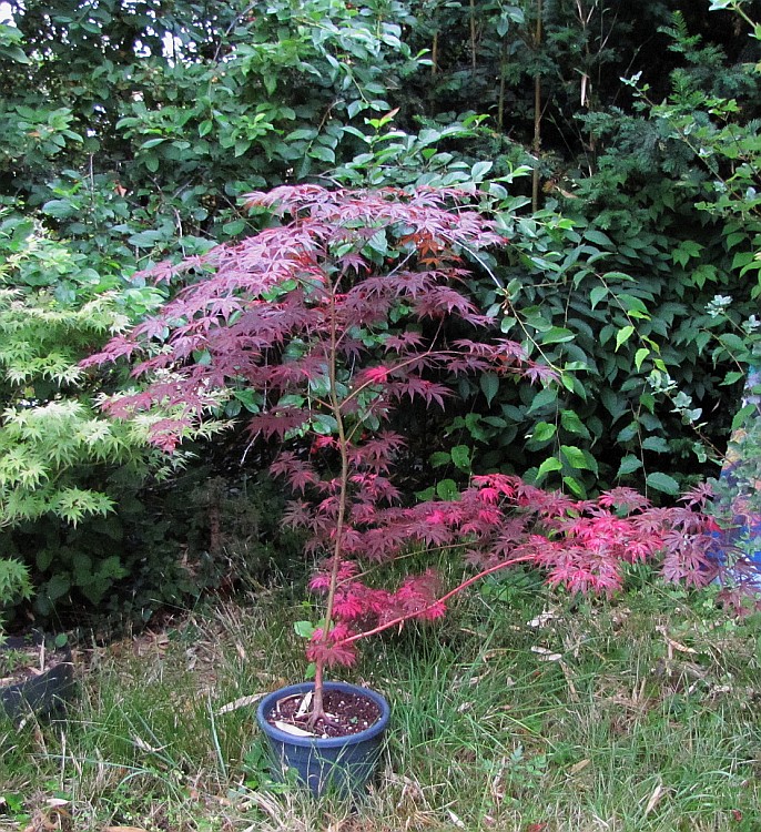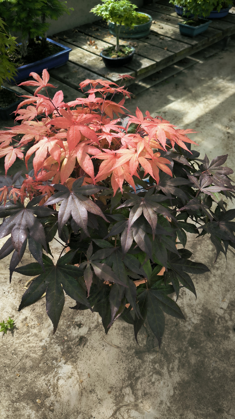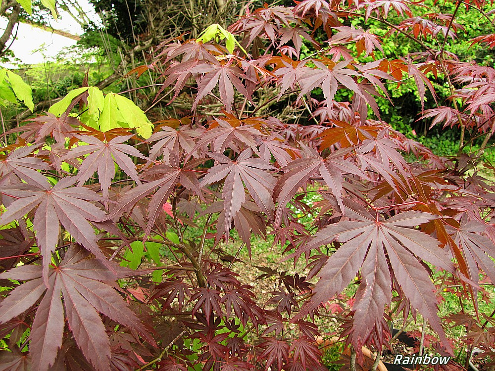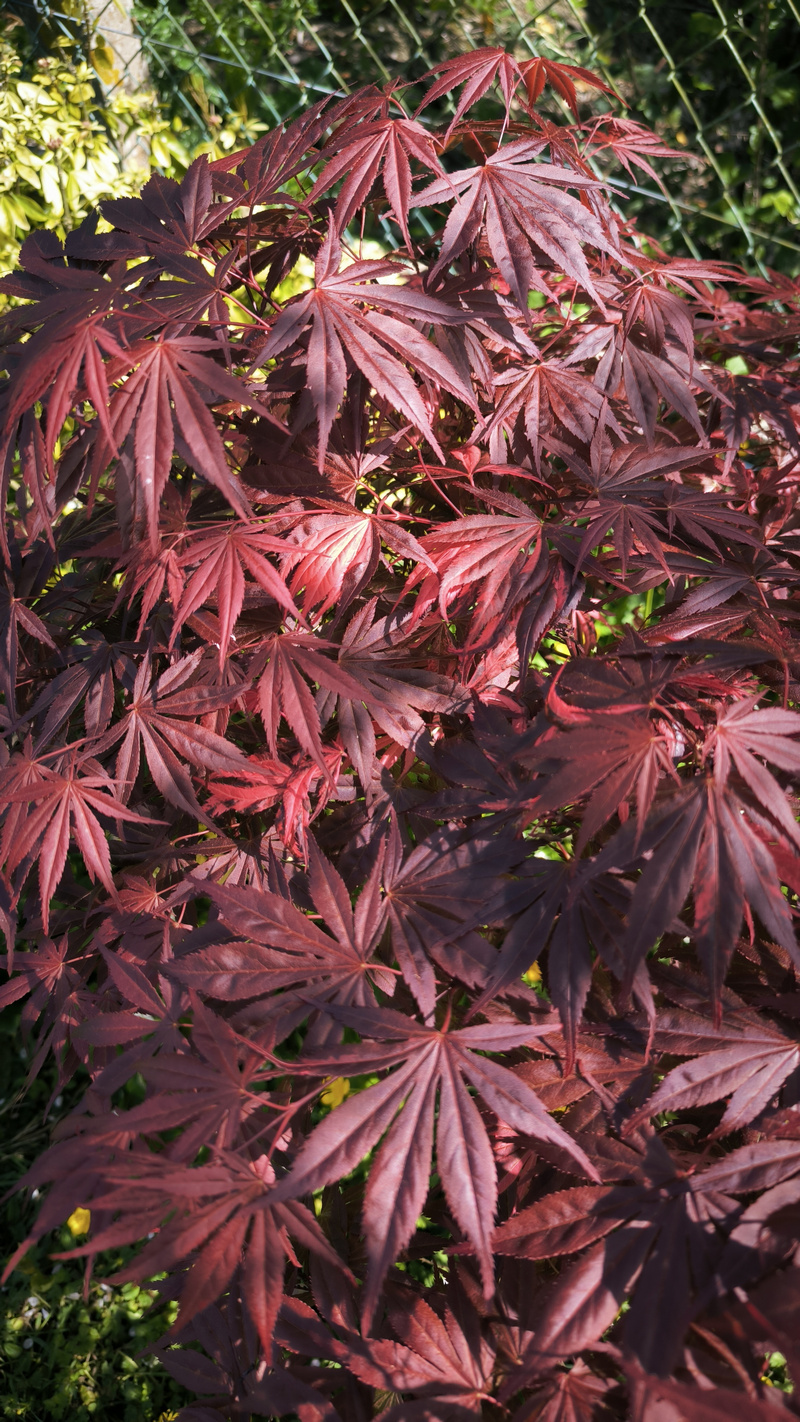 Parmi ceux qui m en ont fait, j ai gardé celui ci. C est un geisha de chez maillot (4-5 ans). Ça fait 3 ans qu il n a plus aucune panachure, c est venu un printemps aucun feuille panachée. Et une forte croissance. C est devenu un bel amoenum pourpre mais avec une couleur beaucoup orangée et claire l été, ce qui le rend particulièrement attractif. Au final, j ai choisi de le garder comme un bel amoenum et je me demande si ça vaut pas le coup de tester ses samarres. Je vois qu il a quelques fleurs cette année