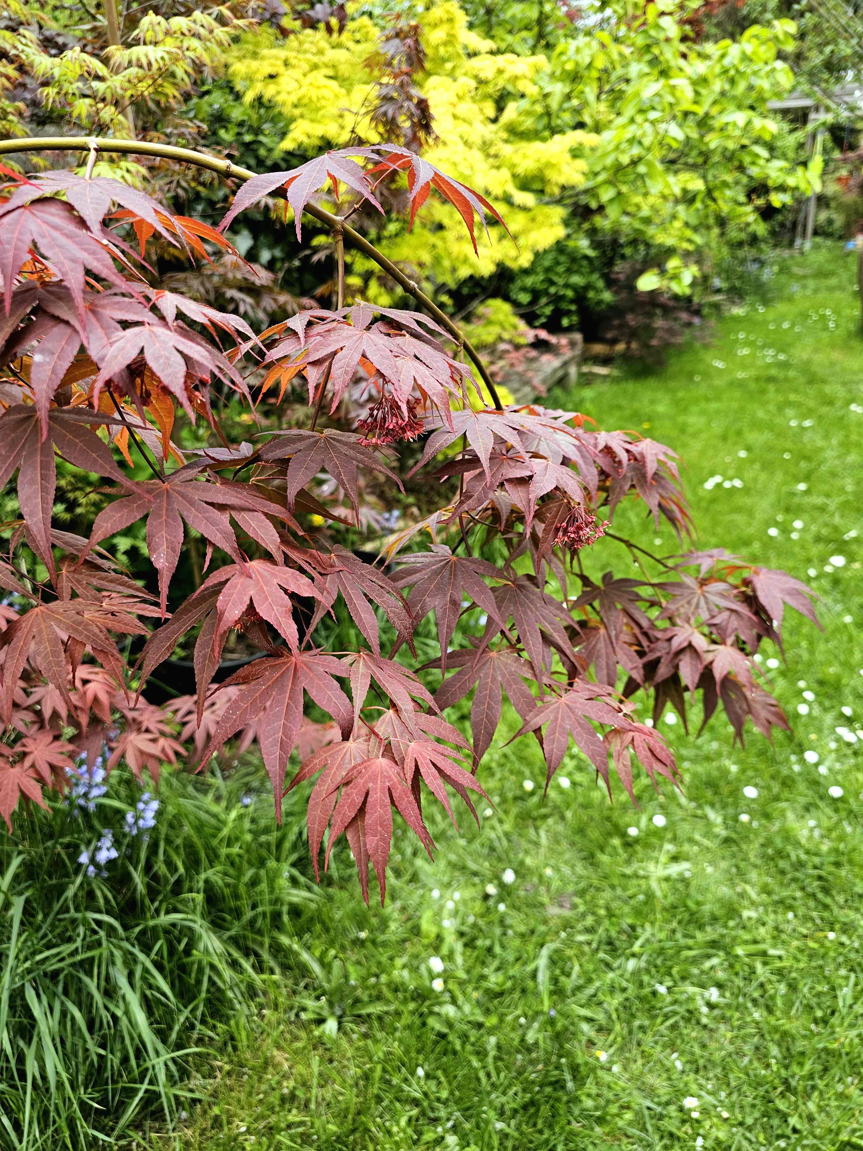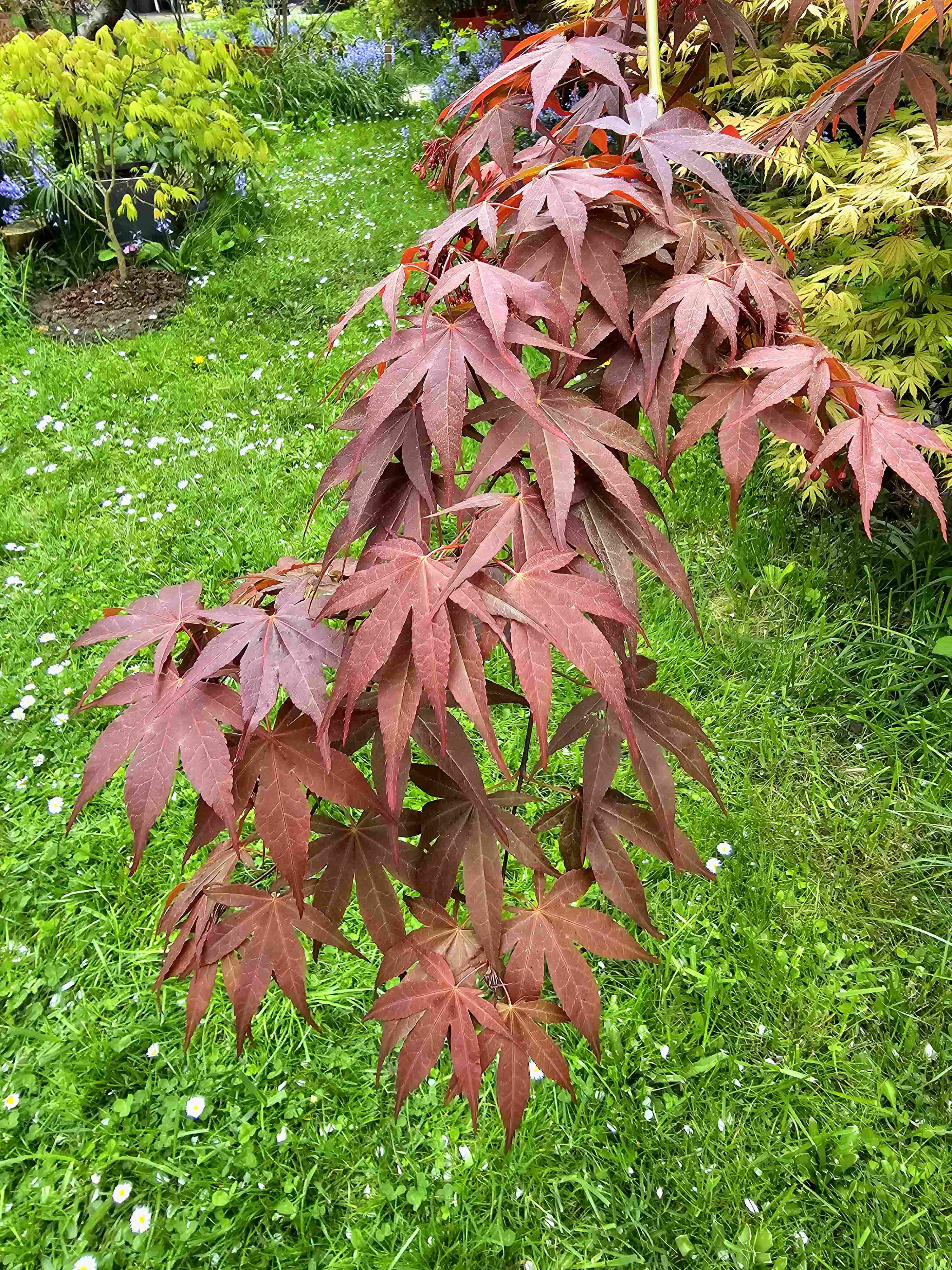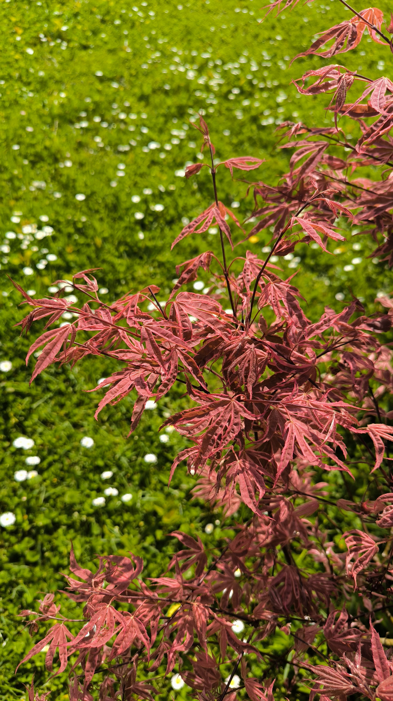 Parmi ceux qui m en ont fait, j ai gardé celui ci. C est un geisha de chez maillot (4-5 ans). Ça fait 3 ans qu il n a plus aucune panachure, c est venu un printemps aucun feuille panachée. Et une forte croissance. C est devenu un bel amoenum pourpre mais avec une couleur beaucoup orangée et claire l été, ce qui le rend particulièrement attractif. Au final, j ai choisi de le garder comme un bel amoenum et je me demande si ça vaut pas le coup de tester ses samarres. Je vois qu il a quelques fleurs cette année