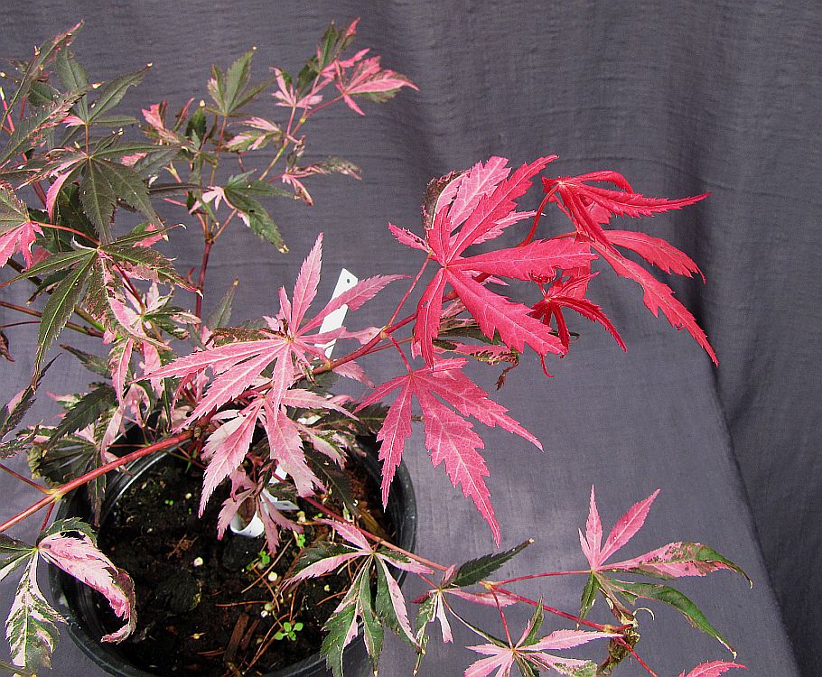 Ceux dont toute les feuilles possèdent la panachure: Ukigomo, Shirraz, Butterfly, kumoi nishiki ...Au même titre que certain ont des feuilles vertes ou pourpres, eux ont des feuilles panachées.Ils sont plutôt stables, rarement une branche repart en réversion et il suffit de la supprimer.