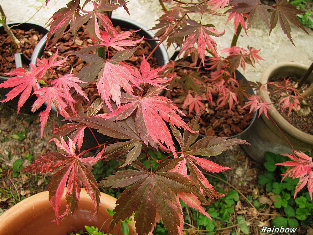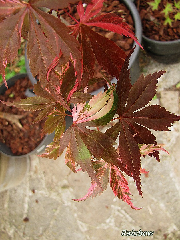 Ceux dont la variégature semble apparaitre de façon aléatoire : Rainbow, Hinode nishiki...Ils sont a surveiller de près afin de réduire le volume de feuillage "normal" au profit de la panachure.