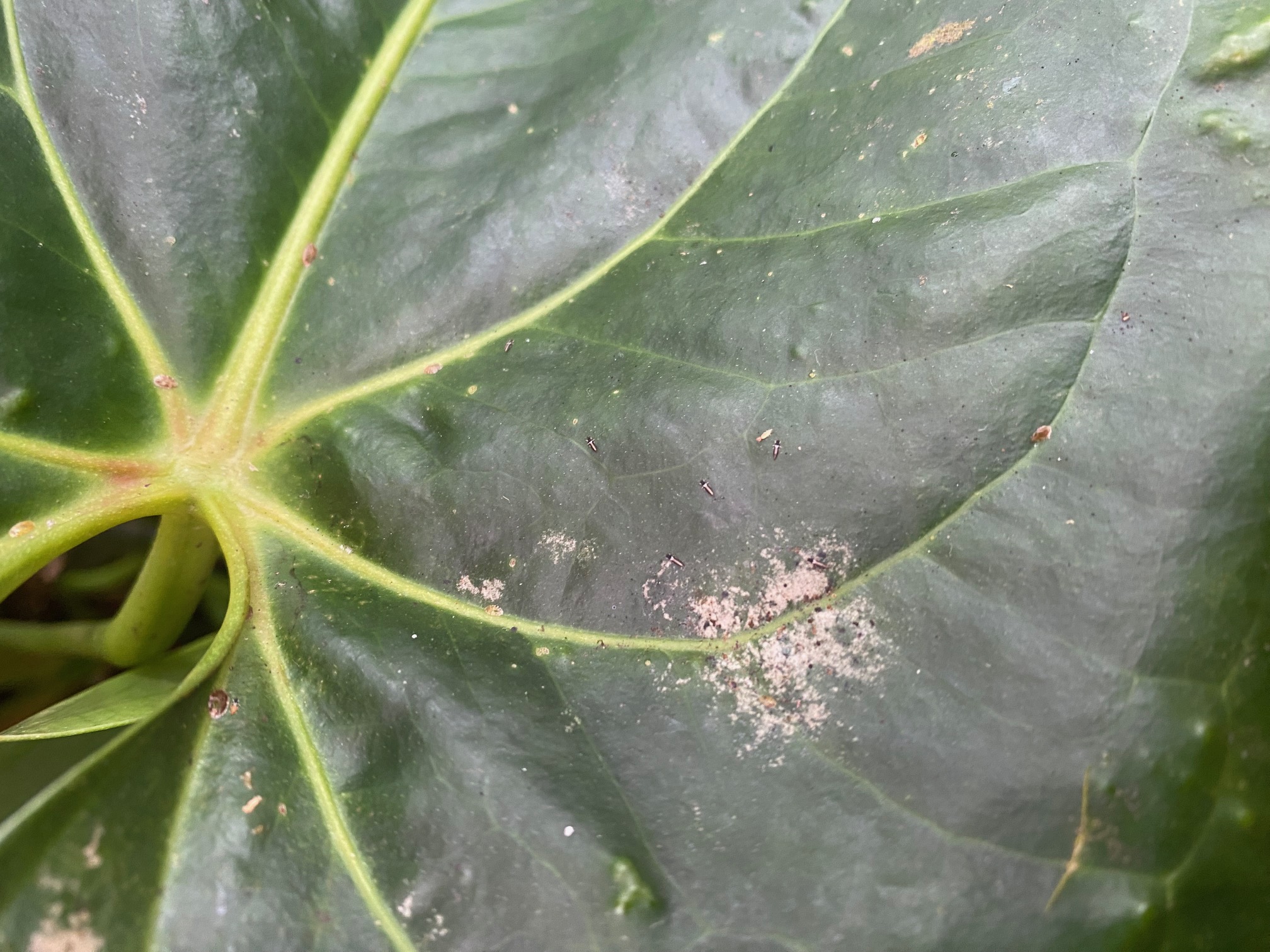 Je cultive des orchidées sous serres tropicale. Pour maintenir l'humidité et pour l'esthétique j'y ai également quelques plantes à fleurs dont des Anthuriums. Depuis une dizaine d'années ils sont devenus bien gros et fleurissent toute l'année. dernièrement apparition de tâches sur leurs feuilles et que sur les leurs. Je n'ai jamais vu ça.