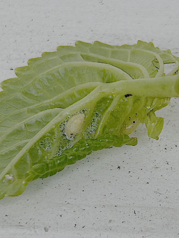 J’ai photographié un insecte caché sous l’une de ces feuilles. Il y a un peu de liquide et des bulles autour de l’insecte.