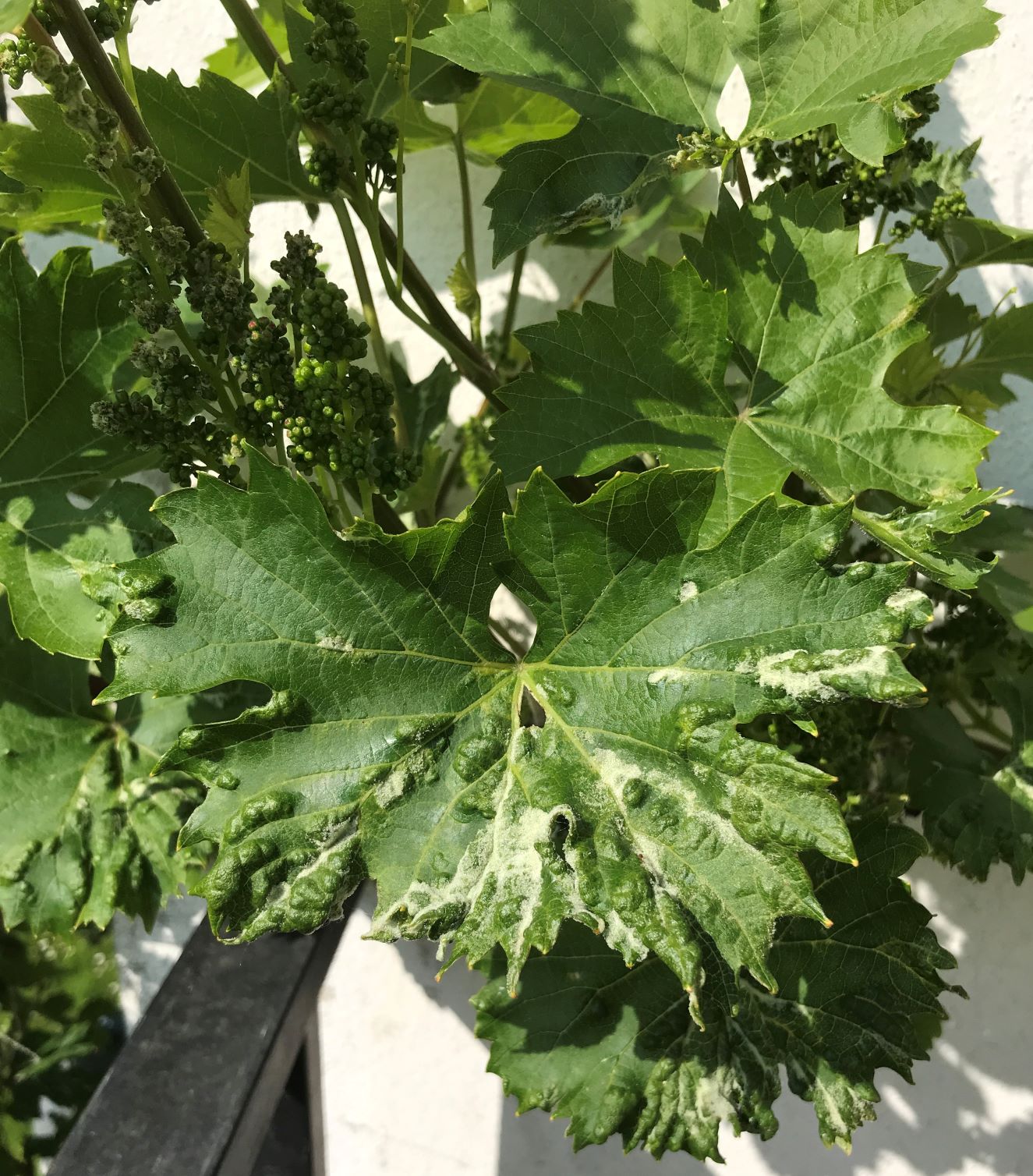 une partie de ma vigne (feuilles et grappes) est couverte d'une sorte de poudre blanche, comme sur la photo. Est-ce bien de l'oïdium comme je l'imagine ? Sachant qu'il s'agit d'une vigne INRA normalement raisonnablement résistante au mildiou et à l'oïdium, quel serait le traitement / la fréquence adaptée ?