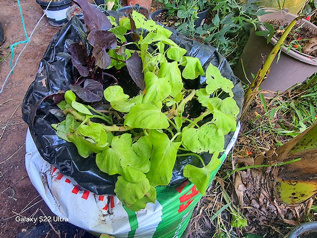 Deux variétés de patate douce dans un sac. La partie aérienne sera utilisée comme grimpante ornementale,quant aux frites,on doit les récupérer au fond du sac :mrgreen: