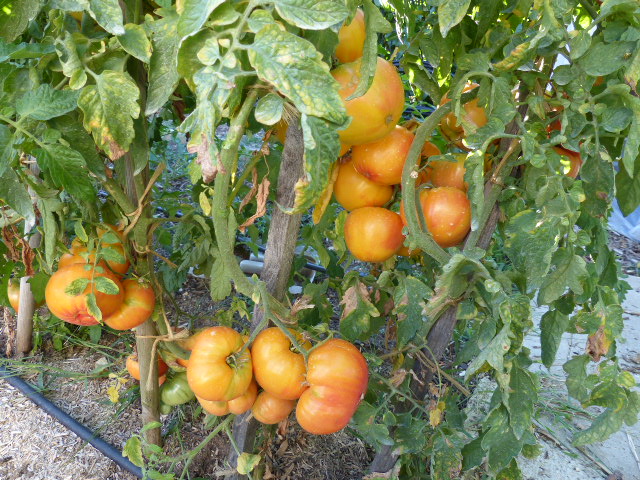 Voilà un plant greffé, la Nature's riddle, celle ci revient tous les ans , douce et généreuse, sur la photo c'est un plant greffé avec le porte greffe radar, le premier bilan est positif très grosse production , estimation entre 13 et 15 kg par contre le format est moyen plus de grosse sur le pied dépassant 1kg mais du nombre mais c'est tardif de chez tardif , probablement accentué par cette saison particulière, par contre toutes ne s ont pas à la même enseigne certaines c'est moyen surtout les variétés à petites feuilles , j'ai remis des piquets pour consolider la bête , elle a été conduite sur 5 tiges , il faudra tenter plus pour essayer, il faut aussi une grosse fertilisation et les besoins en eau sont plus grands sinon point de salut