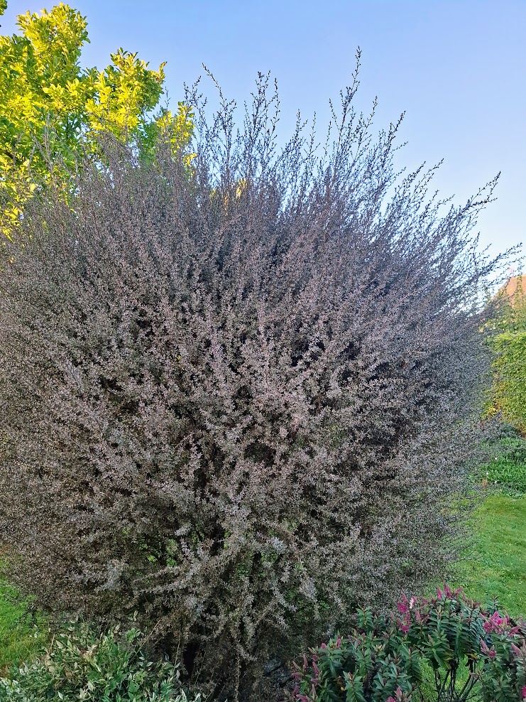 Il fait environ 2m50 et fait de toutes petites fleurs rouges (on pourrait croire qu'elles sont séchées) au printemps et pendant l'été. Quand arrive l'automne, on a l'impression que les petites feuilles se dessèchent. J'ai pensé à un arbuste de la famille des Leptospermum mais les fleurs ne ressemblent pas.