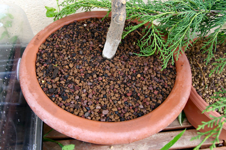 Le mois dernier, je l'ai rempoté en prenant un pot légèrement plus grand que l'ancien dans un substrat composé de 50% akadama, 50% terreau (pour ceux qui ne connaissent pas, l'akadama est un substrat très utilisé en bonsais, ce sont des grains d'argile d'origine japonaise, bon rétenteur d'eau et rendant le substrat ultra-drainant... top contre le pourrissement des racines quoi... Mais s'assèche vite, attention à l'arrosage donc). Puis je l'ai sorti dehors... (mon jardin est orienté nord ouest, soleil direct à partir de 16h-17h).