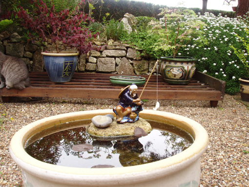 et j'ai fait un coin zen... je n'ai pas de bonzai, mais l'idée c'est de faire une estrade pas cher pour présenter des bonzais, en premier plan j'ai mis dans le pot un nénuphar nain qui n'est pas encore sorti...