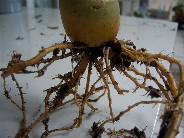 D'après ce que j'ai pu lire, je suis assez contente, ses racines ne sont pas marrons, elles me semblent plutôt saines. J'ai fait un mélange terreau géranium-vermiculite-terreau pour cactées (+ un peu de l'ancien substrat)... Par contre j'ai eu un doute sur la taille du pot, je l'ai remis dans un pot de la même taille comme vous m'avez conseillé mais comme certaines racines sont très longues et s'enroulaient autour de l'ancien pot, je crains qu'il ne soit un peu à l'étroit. Qu'en pensez-vous?